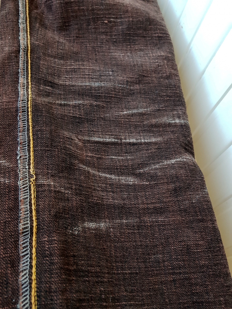 Нить основы окрашена серным красителем канатным способом в чёрный цвет . Нить утка - канатным способом в коричневым цвет с помощью красителя «Ашибу Шибу» , в составе которого хурма .