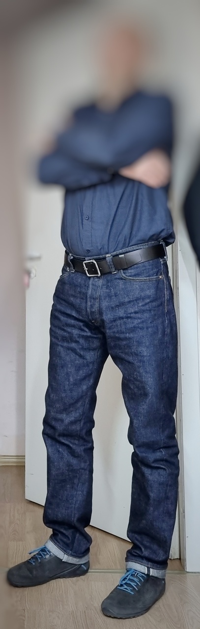 На фото SAMURAI JEANS S510XX 20OZ GA в размере 34.С поясом все хорошо,он совсем слегка растянут, но все что ниже, залезает глубоко туда где это ощущается очень неудобно.