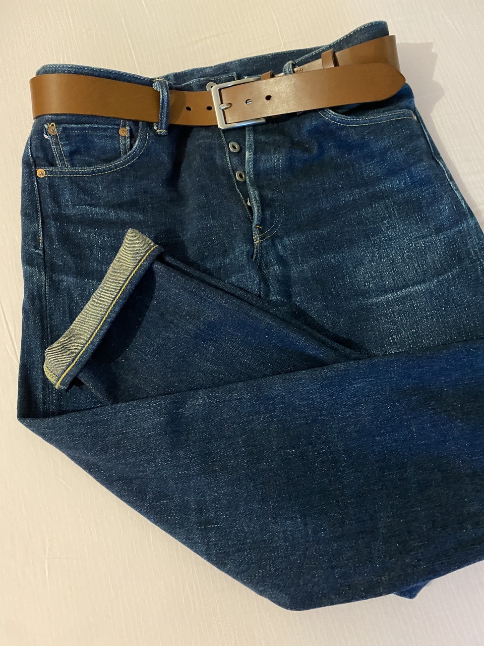 Джинсы изготовлены с использованием всех высококачественных деталей Tanuki, таких как медная фурнитура, вышитый логотип Tanuki на заднем кармане и культовая нашивка Tanuki из оленьей кожи растительного дубления. Вышивка для этого довольно примечательна: множество контрастных синих нитей цвета электрик, которые действительно выделяются.