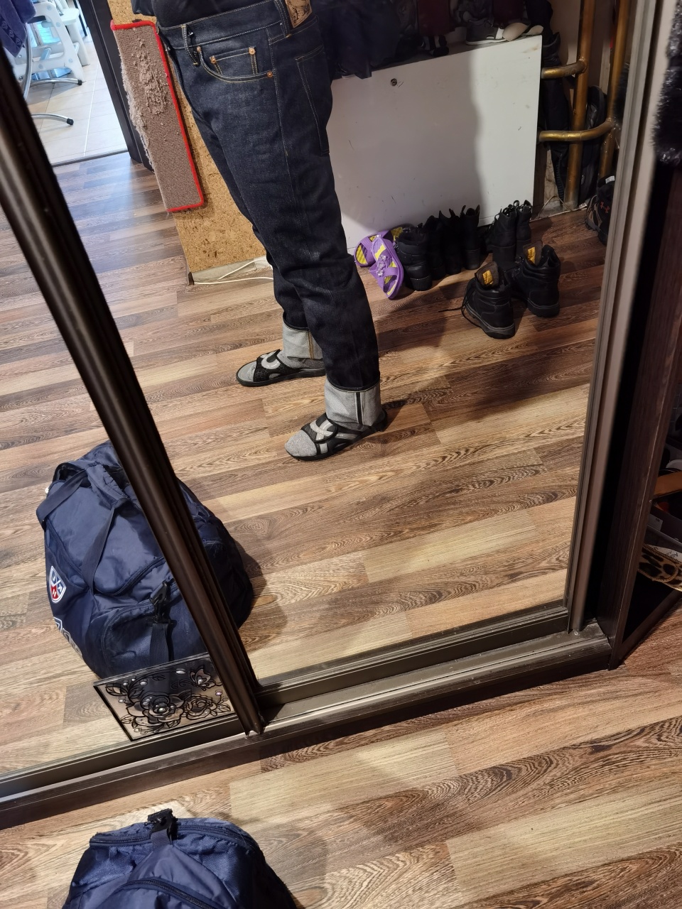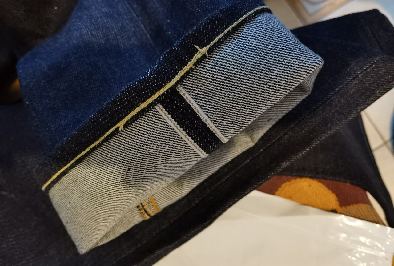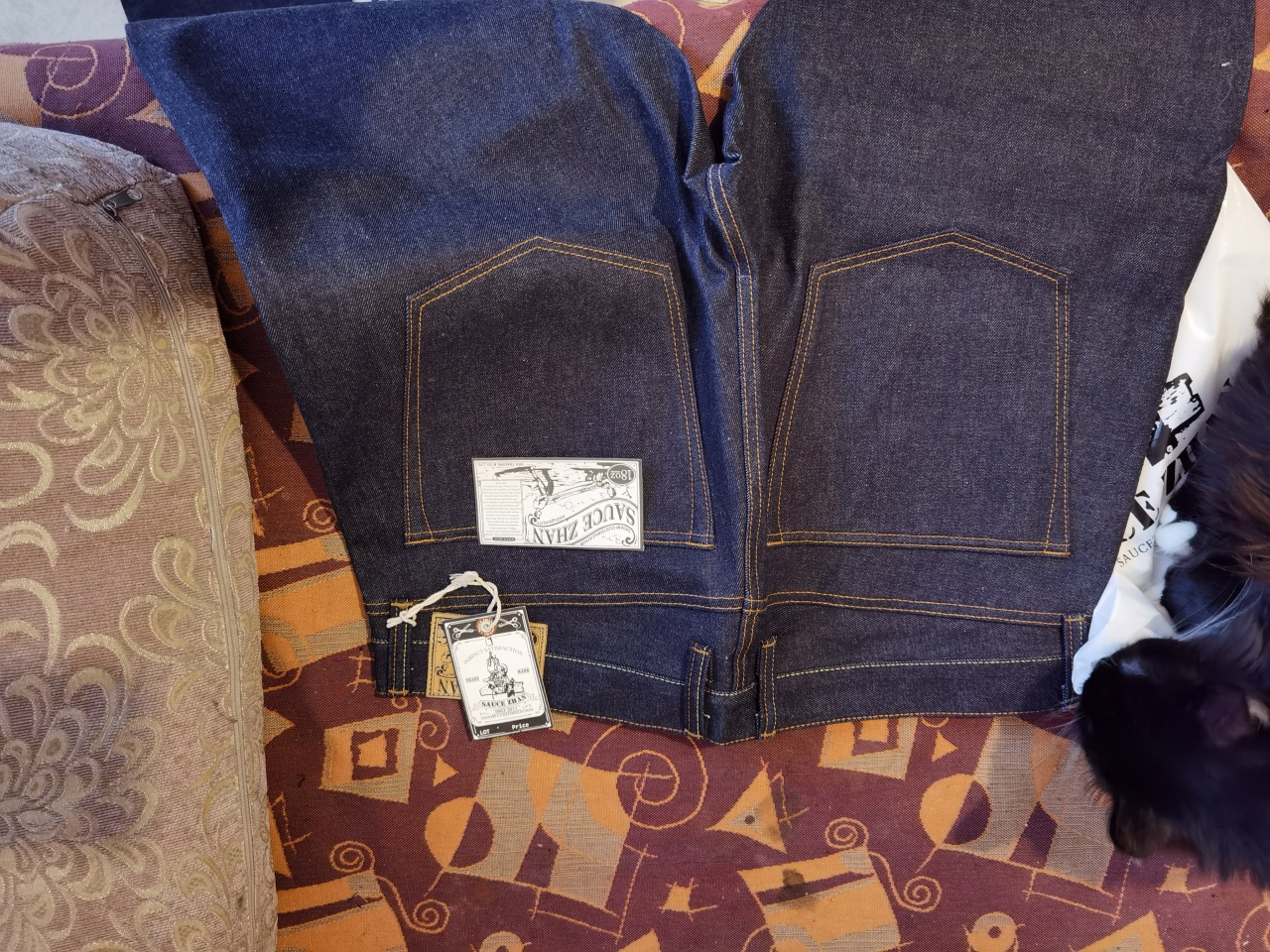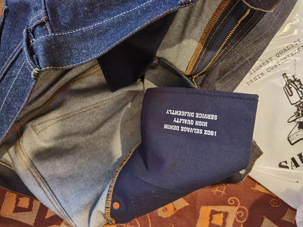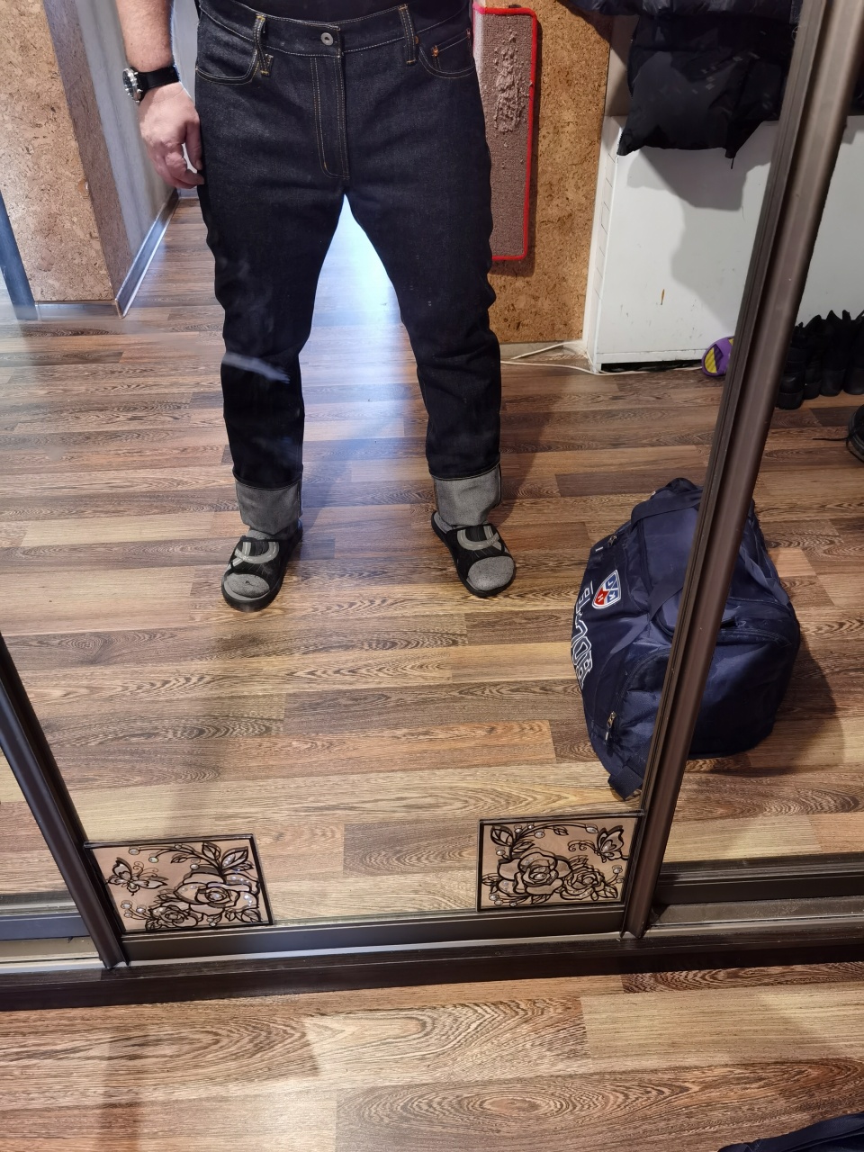 А мне приехали портки от китайских товарищей. Sauce Zhan 18oz. Это мои первые джинсы тяжелее стандарта wrangler 14,7. Химией немного пахнут. Других вопросов к штанам нет. Пошиты качественно. Ниток не пожалели на цепные швы. Приехали дней за 13. Довольно быстрая доставка на кассу Пятёрочки. Прокрашены от души. Иногда кажутся чёрными. И нет стального отлива как на STF от Levi's. И достаточно гладкий деним. Хотя на макро видно, что чуть пушистые. Про фит могу сказать, что очень похожи на Levi's 501, только на молнии. И задние карманы вроде немного побольше. Выбора по длине в магазине не было. Только ширина. Мой размер w38 по длине примерно 34-36. То есть с запасом. И тут не сэкономили.