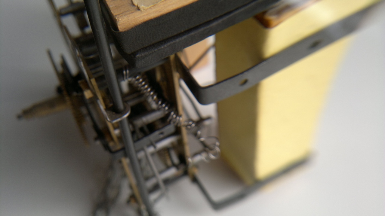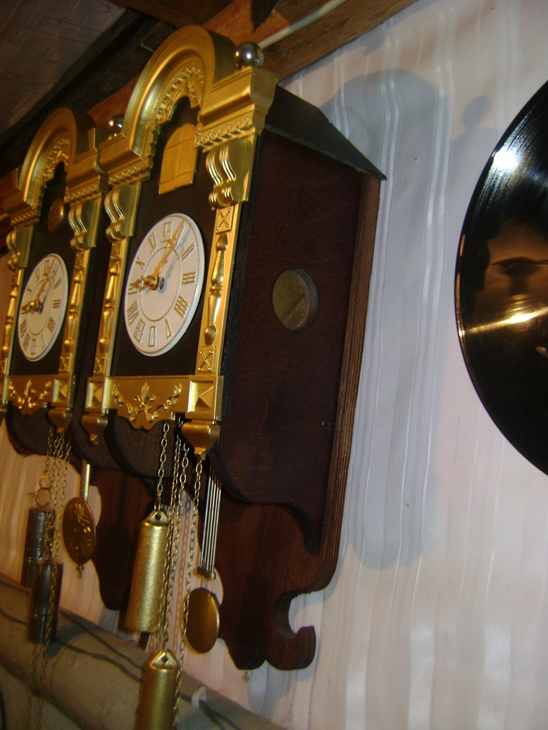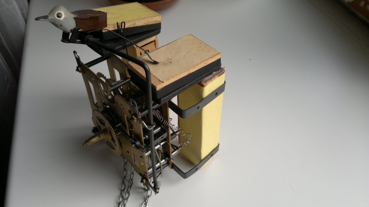 В часы с выдранным боем вставлены два колокольчика от старого телефонного звонка и два импровизированных молоточка, присоединенных к тягам механизма кукушки. (всю эту мою самодельную механику лучше не видеть - ночные кошмары обеспечены всем, не говоря уж о тех кто смыслит в часах))))