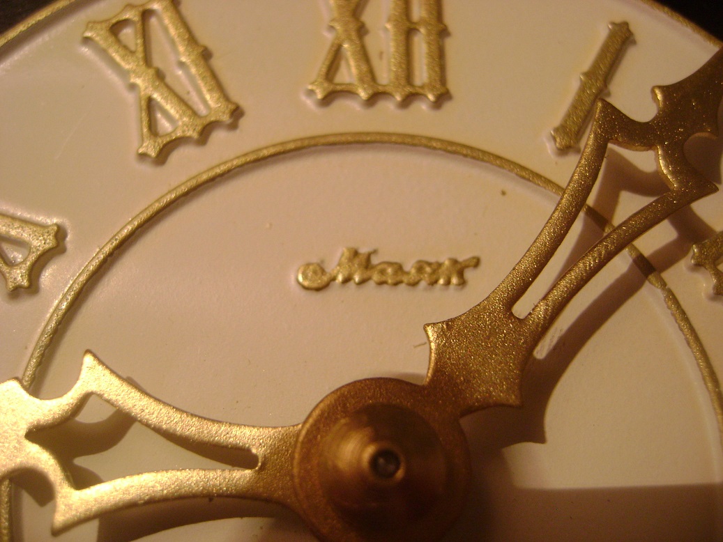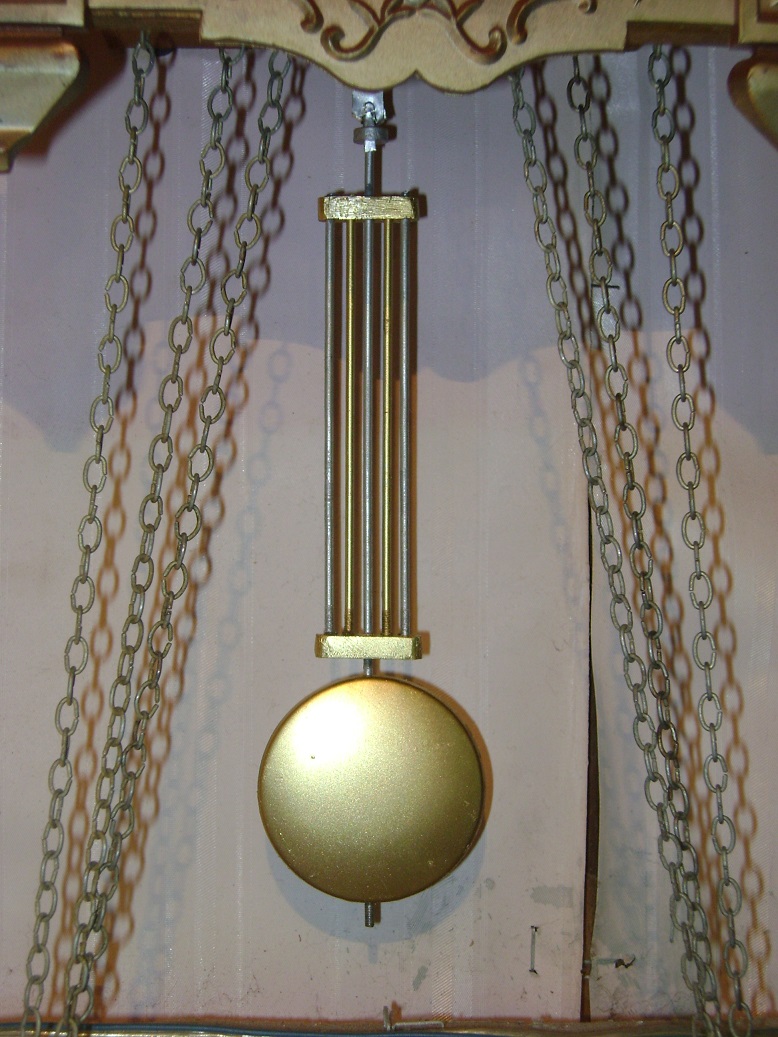 В живых я оставил доску, раму и механизмы. остальное выкинул)))))) То бишь корпуса делал с нуля, из толстой (1.5 см) фанеры, покрывал морилкой в семь слоев и красил матовым лаком, который в аэрозоле. Вообще люблю аэрозольные краски-лаки, (особенно под медь, бронзу, золото и прочие железки) ибо они красиво ложатся, но из-за большого расхода использую их только для мелочей. Ну вот собственно, рамы, цепи, стрелки, гири и маятники окрашены под золото.
