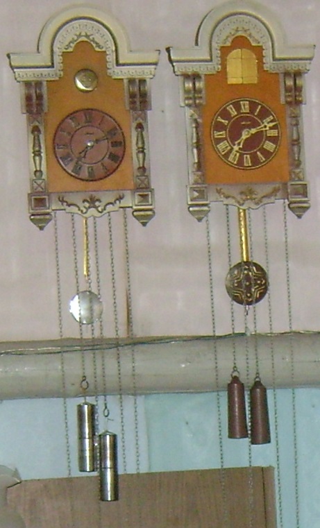 Соответственно часы теперь издают звонкий двухтональный "бим-бом". Часы с сохранившимся родным механизмом бьют в гонг и "кукуют", при этом птичка-крыска вылазит из-за самодельных дверок и едва заметно качает носом)