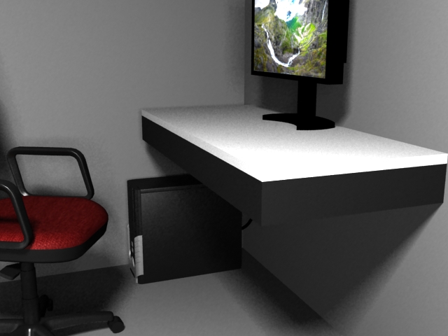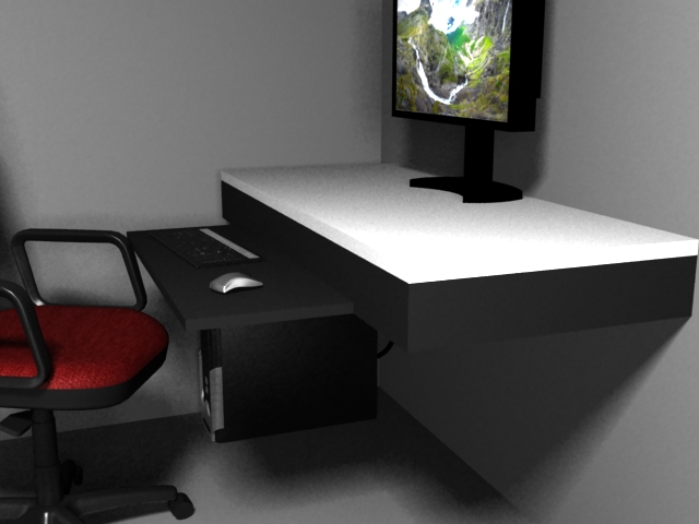 Так, что получается. Пока есть набросок контрастного настенного стола в минимал стиле. Модель примитивная, на скорую руку, всякая периферия честно стырена из сети. Посему, за качестово рендера прошу не пиннать. Это лишь для демонстрации идеи.