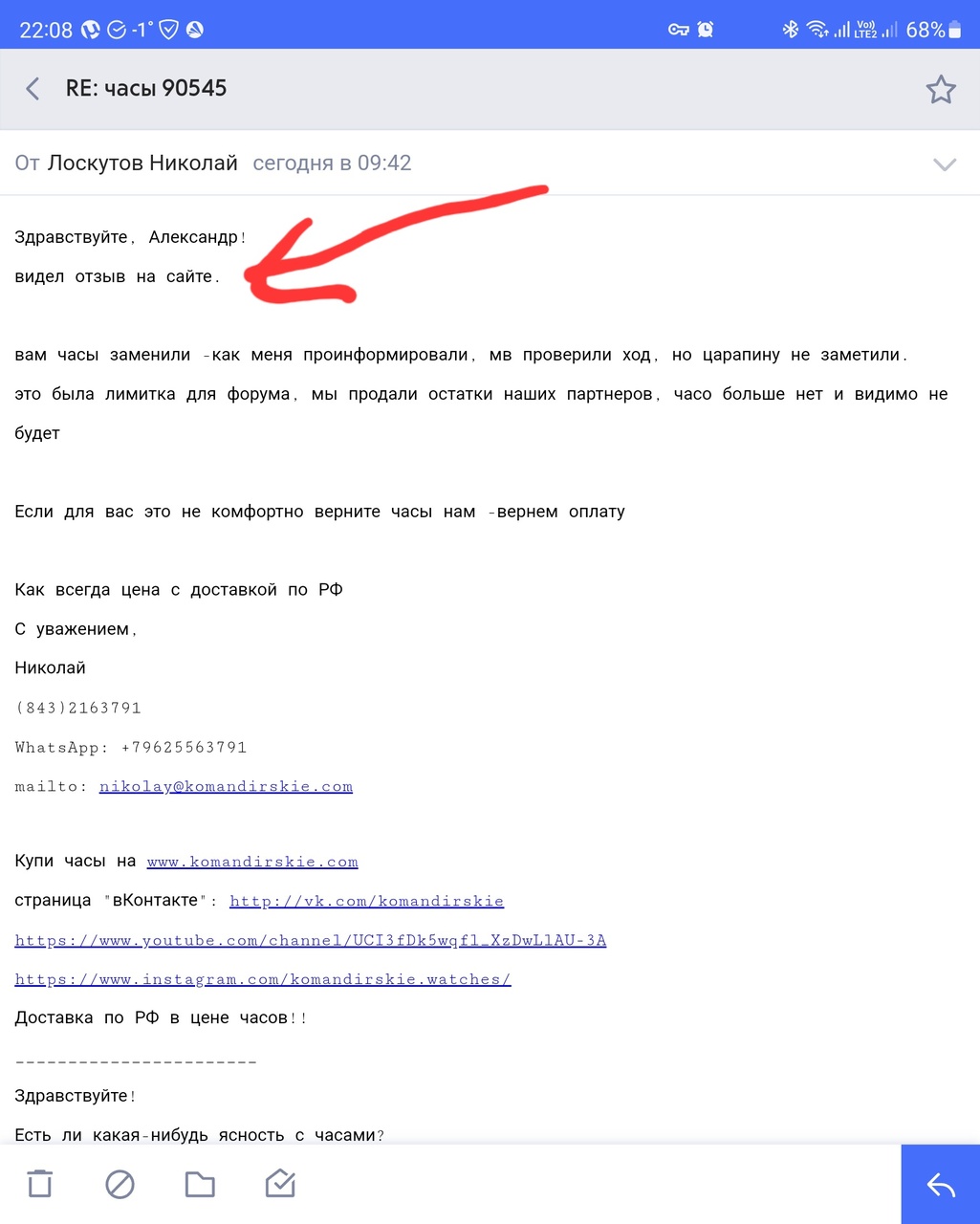 Добавлю свою бочку дёгтя. Заказывал с этого магазина браслет на амфибию. Насторожило, что нет ни одного отрицательного отзыва. Но, браслет перевесил здравый смысл. Заказал, получил, с этим особо не возникло проблем. Есть проблема с самим браслетом. Он ЗАРЖАВЕЛ через два месяца носки! Я с руки никогда часы не снимаю, и в один день очень удивился, обнаружив на руке зелёный след