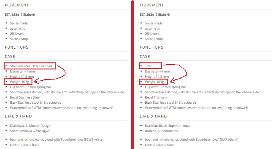 на сайте Штейнхарт, мы видим, что разница в массе, между титановыми и стальными часами, составляет всего-навсего 4 грамма.