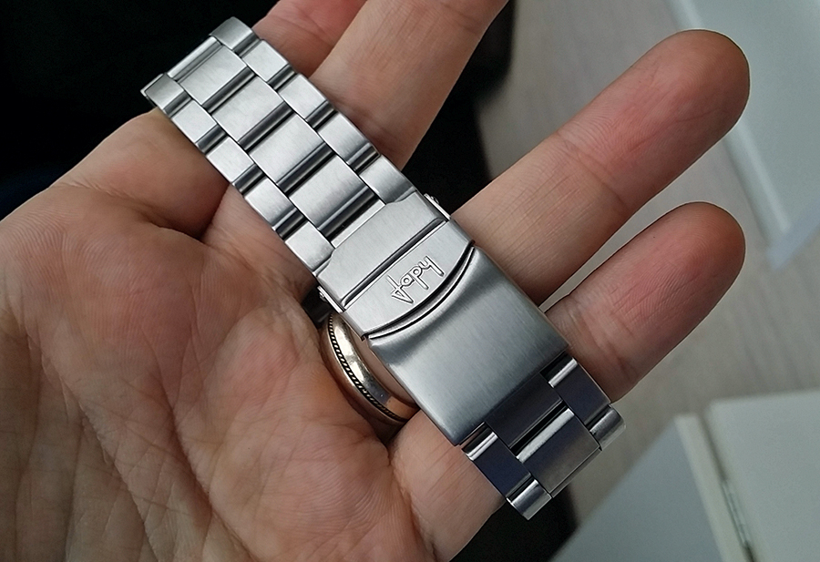 Браслет и корпус. Полностью сатинирован. Сделан качественно, но без особых изысков. Разве что по ободку безеля симпатичные бороздки идут.