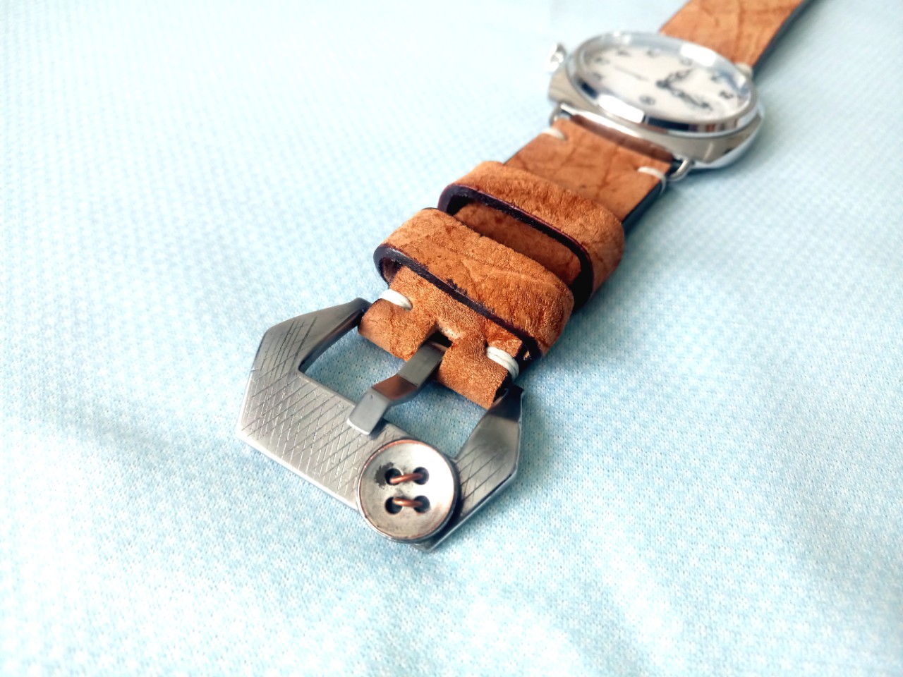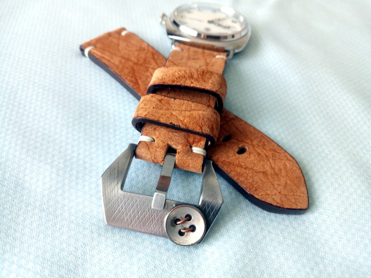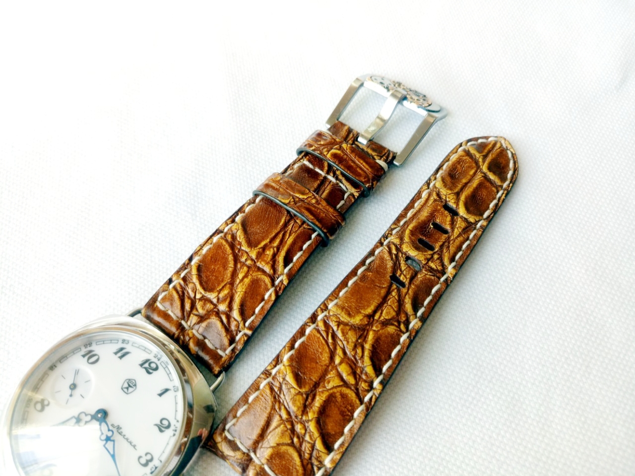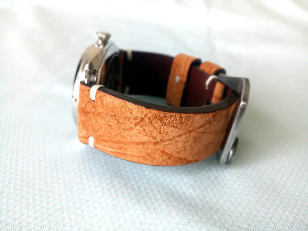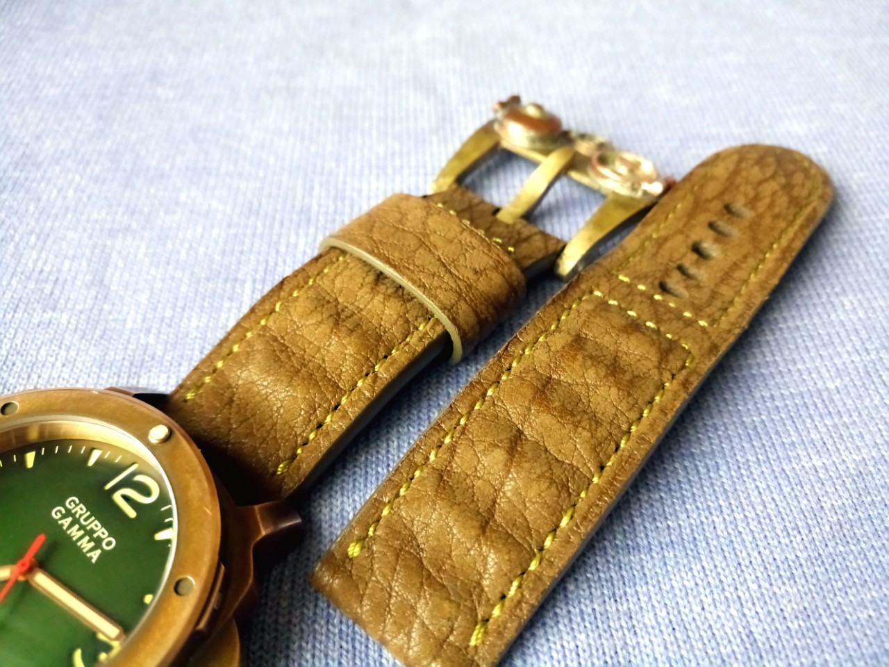 - Ремешок из кожи слона коричневого цвета с ниткой темно-оливкового цвета под цвет люма на цифрах и стрелках. Ремешок имеет рельеф в виде гребенки около часов.