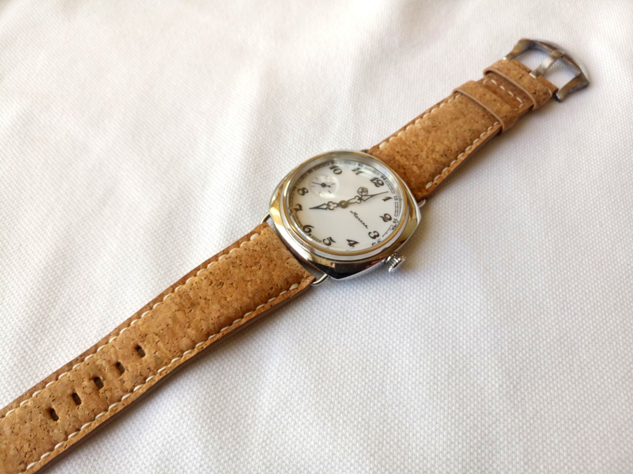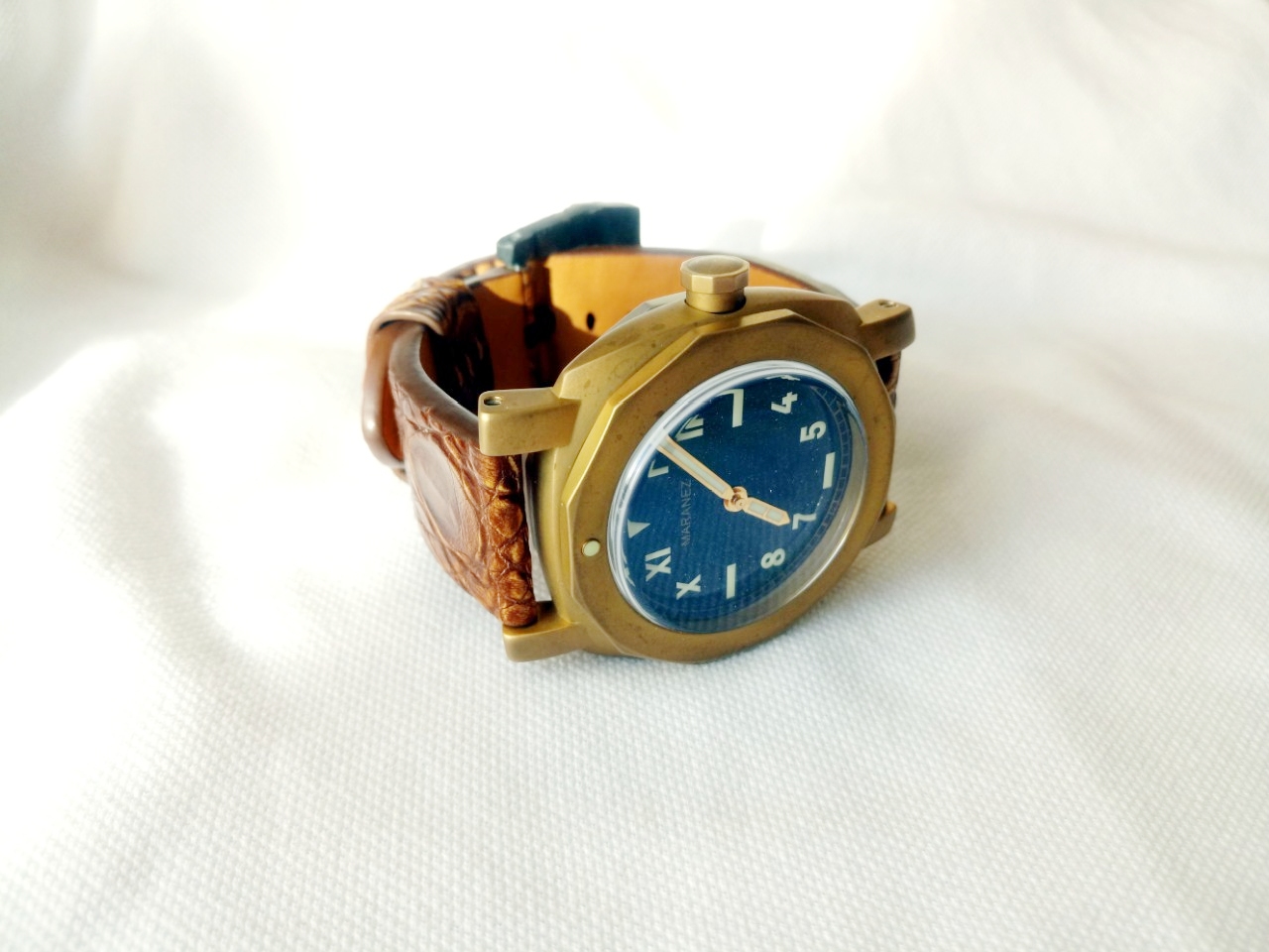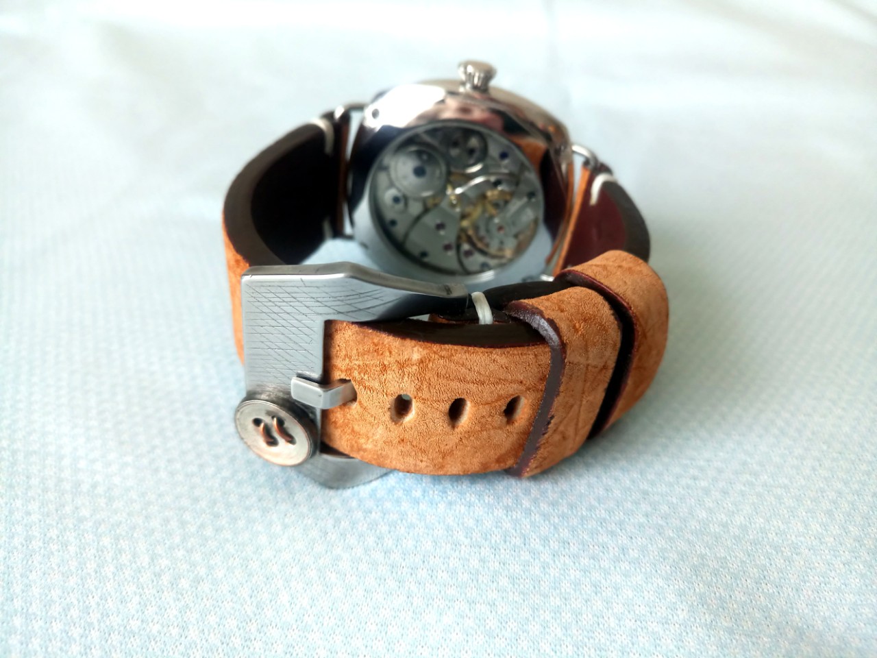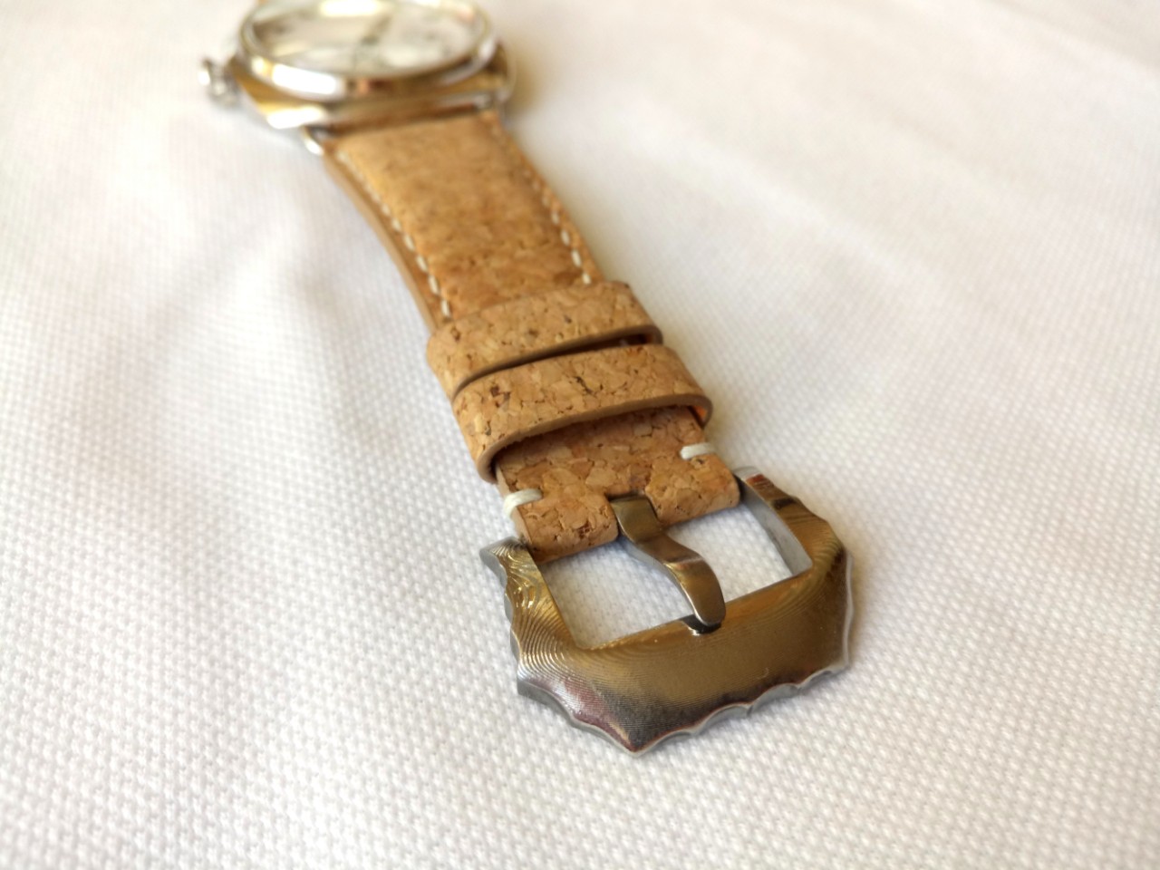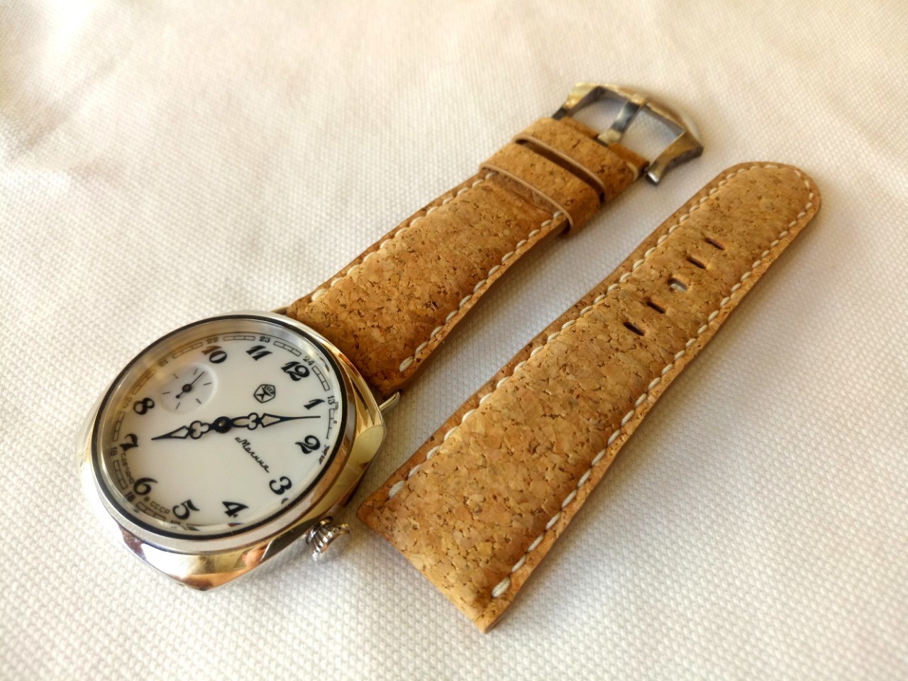 - Ремешок из кожи слона коричневого цвета с ниткой темно-оливкового цвета под цвет люма на цифрах и стрелках. Ремешок имеет рельеф в виде гребенки около часов.