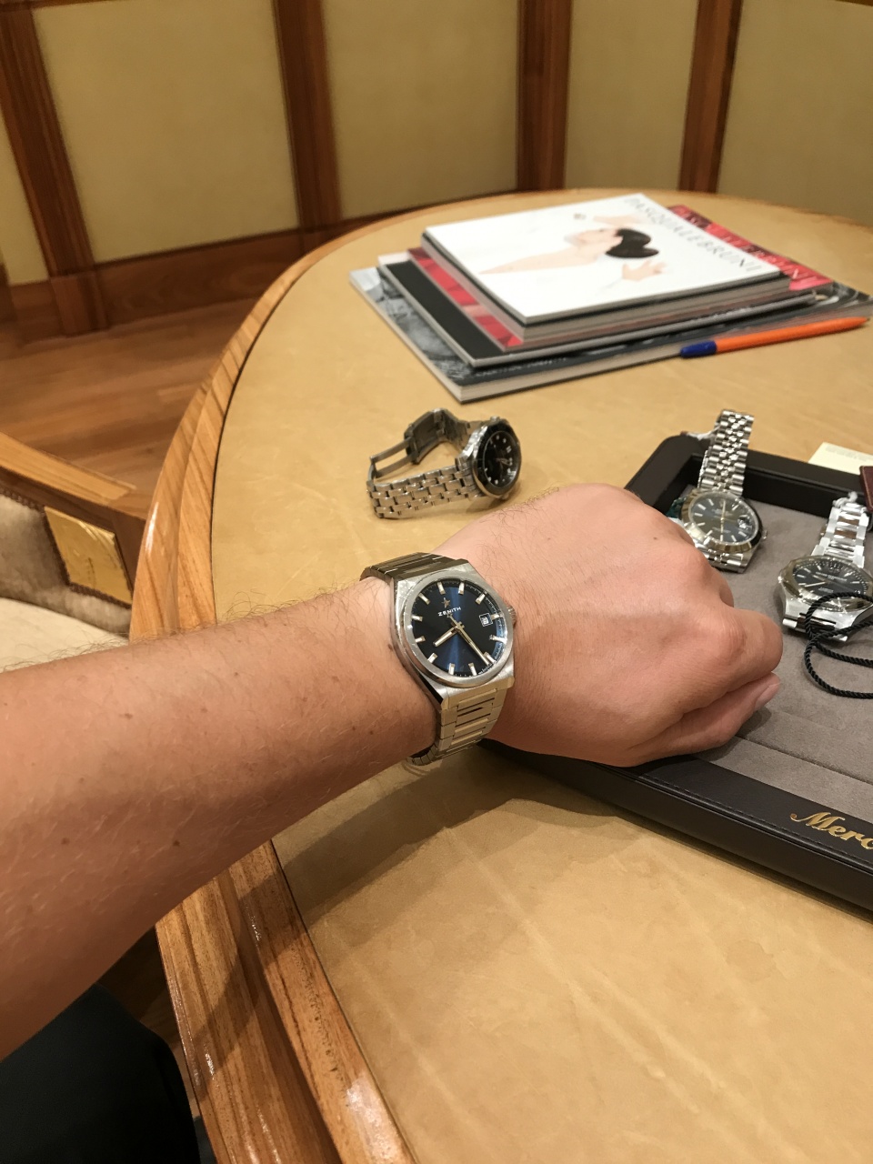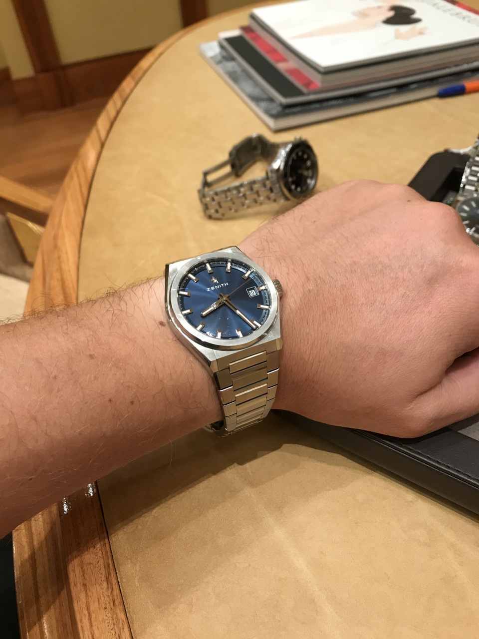 - ZENITH DEFY - вот эти часы действительно понравились. Видимо, потому что никак на них не рассчитывал) Понравился цвет циферблата, он оказался неожиданно глубоким. Смущает некоторая вторичность дизайна, что ли, но в целом часы произвели отличное впечатление. А что там у них по механизму?