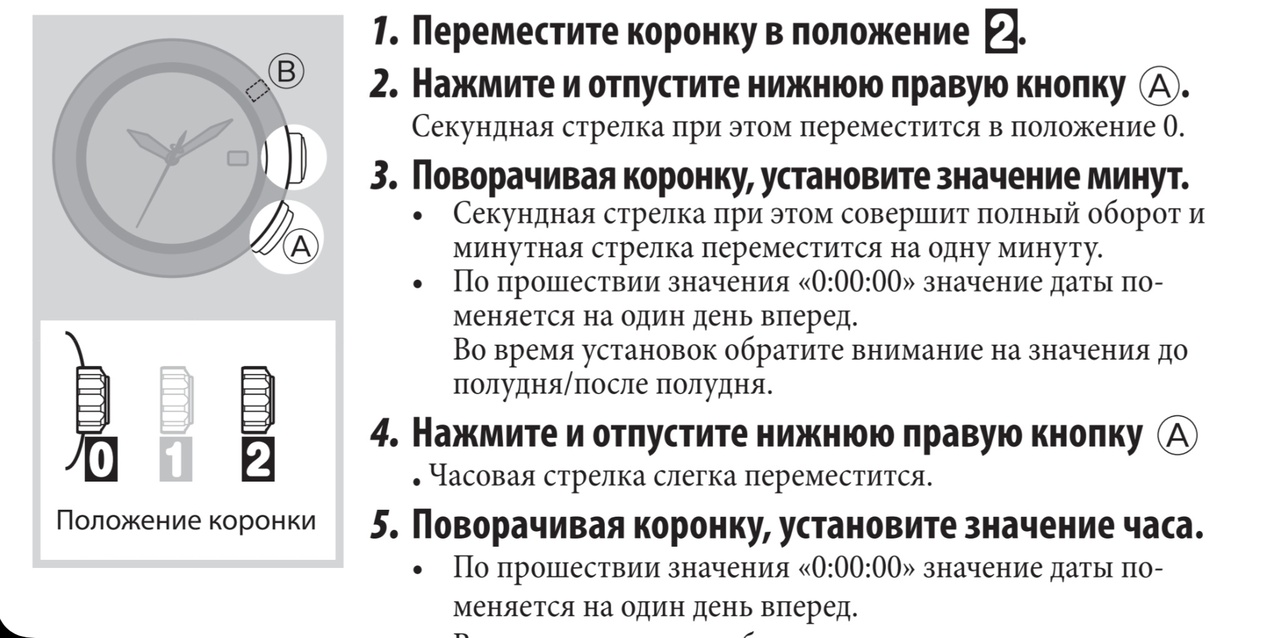 ЗГ вытягиваете на 2 щелчка и нажимаете кнопку снизу. Секунда встанет в положение ноль. Поворот ЗГ вперёд - минуты идут вперед. ЗГ назад - минуты идут назад. Выставляете секундную стрелку на ноль, выставляете правильные минуты и смотрите на эталонных часах, когда их секунда придёт на 0 и задвигаете ЗГ обратно до упора. Время выставлено.
