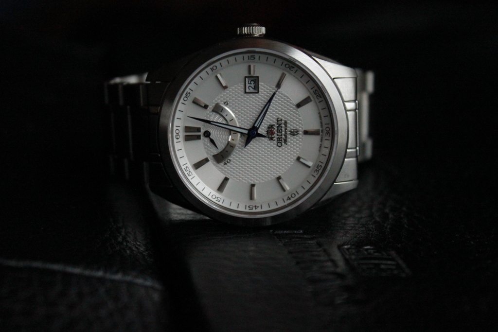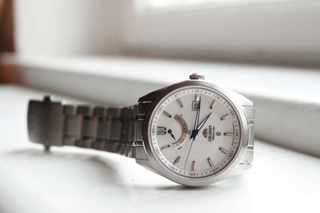 Остановил выбор на Tissot Le Locle с индикацией резерва хода и нескольких моделях Epos, другие марки в принципе уже не рассматриваю. Прочитал много тем об этих брендах и моделях, решил, что нужно смотреть на руке, в живую может быть все по другому (из опыта приобретения двух Tissot), да и до дня рождения времени еще достаточно. 23 февраля поехали в alltime на ш. Энтузиастов. Оказалось, что в этом магазине ни Tissot ни Epos не представлены. Ну что ж ходим с девушкой по салону, с удовольствием разглядываем Японию, к тому же выбор там довольно обширный. Увидев в живую Seiko premier с открытым сердцем закралось сомнение в покупке Tissot или Epos, но т.к. в этот раз покупать ничего не собирался, померил и поставил обратно на витрину. И вот Orient Power Reserve, белый цифер, индикатор запаса хода, красивейшие синие стрелки, дата, (ну вы сами все прекрасно знаете), функционал как у Tissot Le Locle и всего за 7300! Надев часы на руку, понял, что сегодня я без них не уйду, тем более на форуме видел только положительные отзывы об Orient. Вот так на 23 февраля я сделал себе недорогой, но очень красивый подарок!