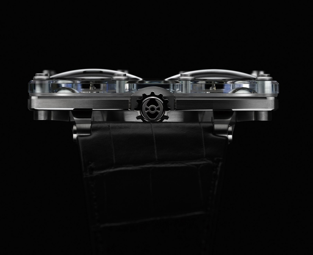 Плавно изогнутая сапфировая панель с верхней стороны корпуса позволяет детально рассмотреть балансовый мост, который имеет обтекаемую форму. Его центральная часть срезана так, чтобы максимально открыть колесо баланса и продемонстрировать истинную «кинетику», свойственную «кинетическим скульптурам» MB&F.
