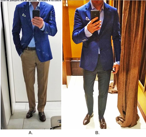 5. Посадка брюк - рабочая, низ подшит неграмотно: наехал на языки мокасино-тапок. В результате, две складки : в коленях и в районе щиколоток. Некрасиво. Убери – сделай короче, как