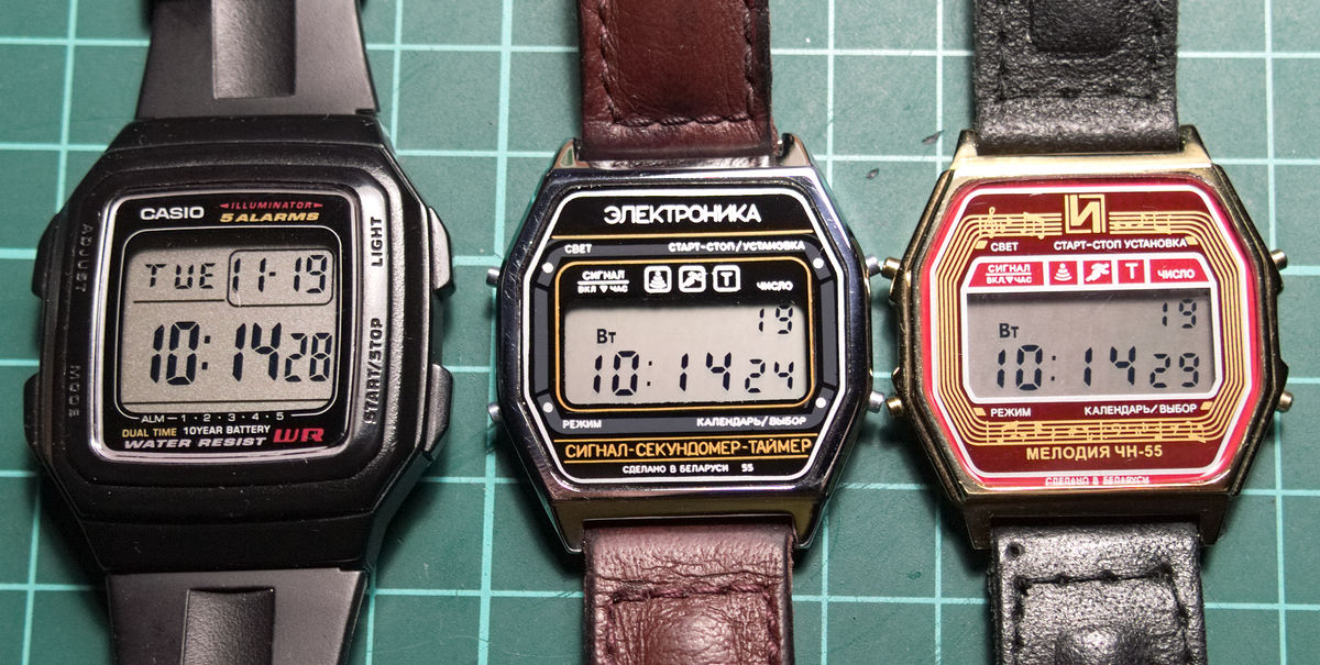 Вообще экран лучше, чем на красных ЧН-55 - под наклоном не видно прозрачных токопроводящих дорожек. С такой доработкой цифры различимы даже в сумерках и вообще теперь я доволен часами.