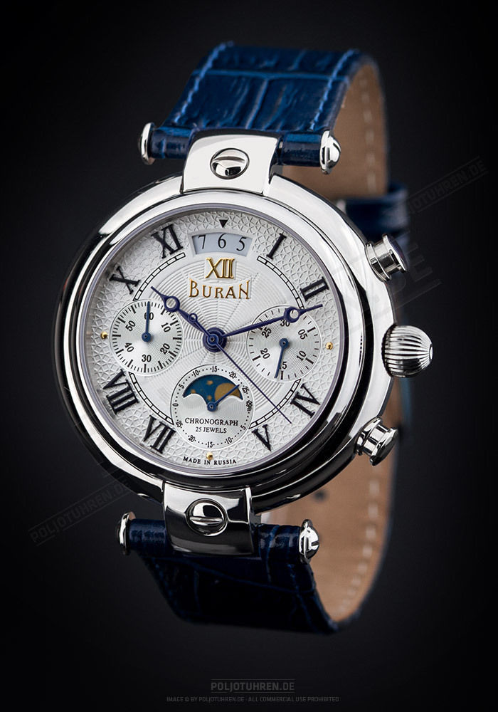 Циферблат: Серебро, две пластины Goldfluss. Римские и арабские цифры цвета розового золота. Накладное окошко указателя фазы Луны цвета розового золота. Луна в виде полусферы из белого перламутра.