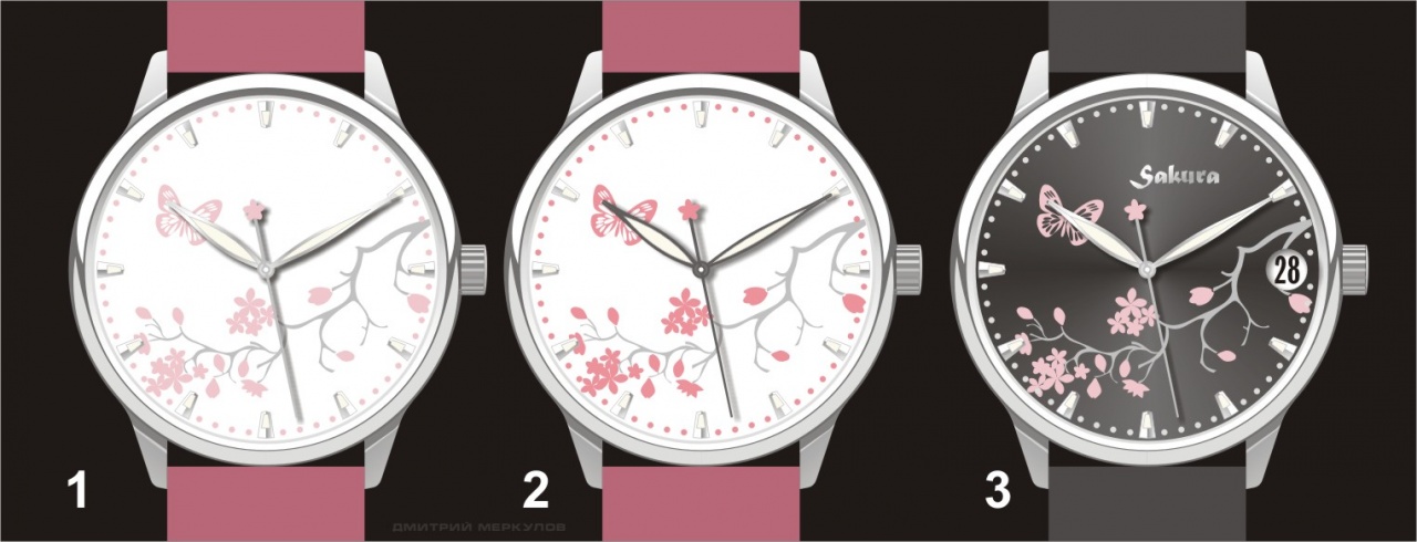 Стрелки часовая и минутные как на первых трёх идеальны. Думаю другая форма ни к чему. Да, цветная сакура не в кассу и бабочка лишняя. А вот метки накладные треугольные с люмом тоже хороши.
