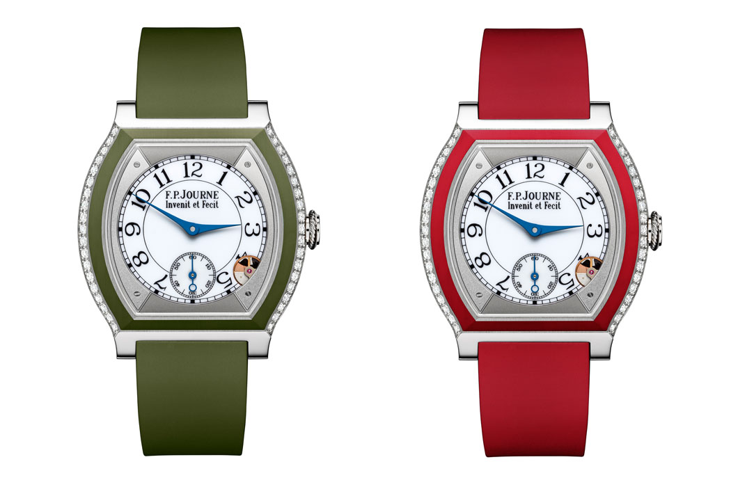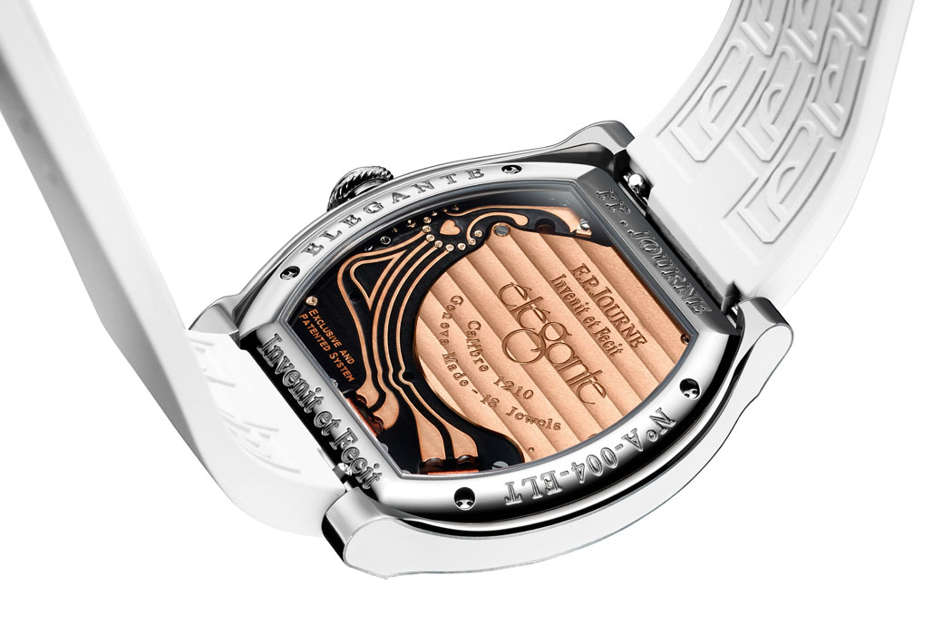 Корпус с каучуковым браслетом, плоский и выгнутый, чувственно подойдет любому запястью, будучи исключительно эргономичным. В циферблате Ф.-П.Журн остается верен своей философии, даря очень большую читаемость времени. Выполненный при помощи той же техники, что используется для создания перегородчатой эмали, корпус часов «élégante» отделан перегородчатым каучуком.