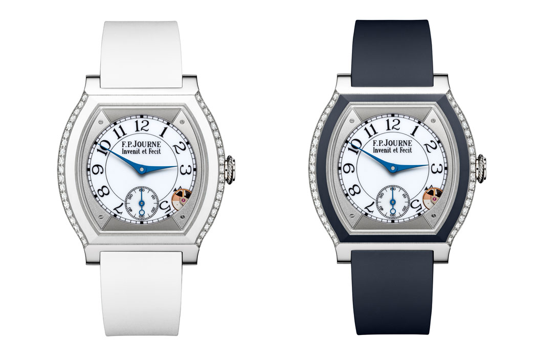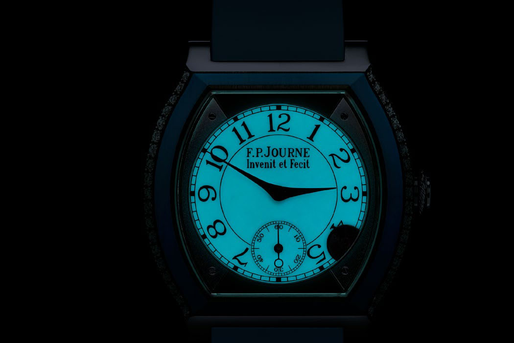 Другая новинка – это люминисцентный циферблат в модели из Титана, игра света которого напоминает белый перламутр. Циферблат позволяет оптимальную читаемость времени вне зависимости от времени суток. Ночью стрелки отсчитывают часы подобно китайским теням. Для того, чтобы довести до совершенства свою первую женскую коллекцию, Ф.-П. Журн выбрал корпус в форме Плоской черепахи (запатентованная модель ®).