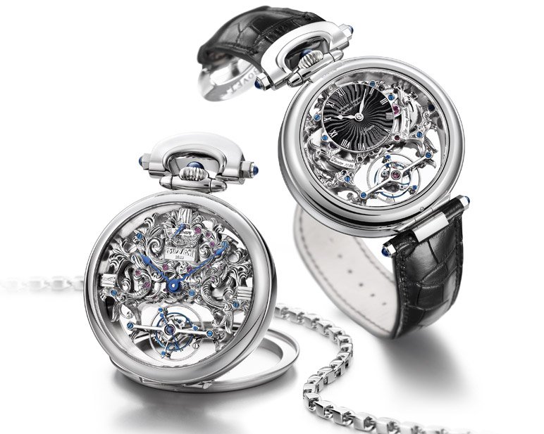 Иначе реализовали идею трансформации часовщики из Cartier. Их скелетонированные часы с вечным календарем, турбийоном, хронографом из карманных превращаются в настольные – прилагается специальный портик из обсидиана и горного хрусталя. Часы оснащены механизмом с ручным заводом 9436 MC с 8-дневным запасом хода. Круглый корпус диаметром 59 мм сделан из белого золота. Механизм окружен кольцом из римских цифр. Заводную головку венчает сапфировый кабошон. Скелетонированный циферблат украшают вороненые стрелки в стиле Бреге. Всего выпущено 10 экземпляров часов: пять в корпусе из белого золота, еще пять – в корпусах, инкрустированных бриллиантами.