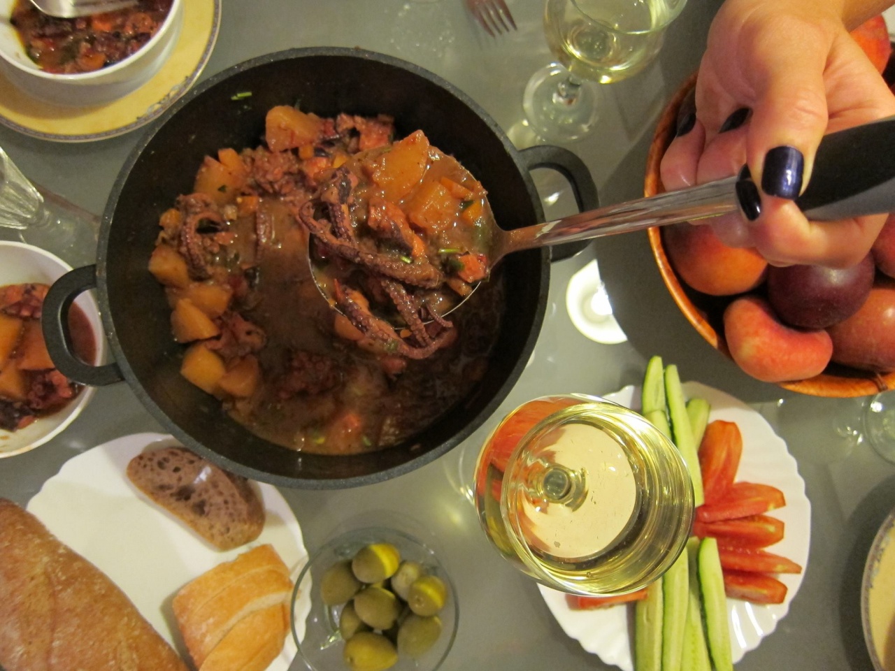 В этом году мы чего только летом на брягу не готовили (впрочем, как и в прошлом) … я самолично освоил дроб чорба (похлебка из бараньих потрохов с массой ингредиентов – есть на фото), шкембе чорба (это самый эпический суп на сей бренной земле -говяжий желудок на молоке – есть на фото) … Павлик отрывался на тему пловов из мясного разнообразия (высший топ получился из утиных грудок), постоянно запекали на гриле рыбу, начиная от брутальной цацы и заканчивая калканом, паламудом, лефером, зарганом, лавраком (сибас), турецкой дорадой и любимейшим ватосом (скат). Но самый «кулинарный эпос» приготовили чуть ли не в последний день, а точнее, ночью… Едем мы после тяжкого шестичасового холдема, прям скажем, весьма грустные и жутко голодные… смотрю , три часа ночи , а наша любимая рыбная лавка близ Несебра работает полным ходом. Останавливаемся, заходим, а там, панимаш, идет приемка снеди среди которой наисвежайшие осьминоги. От жадности хватаем парочку средних – каждый по 3 кг. (они очень сильно увариваются, упариваются – 6 кг., это так, для троглодитов слегка почавкать) и топим до дома, предварительно решив доверить готовку женской половине конфессии. По приезду понимаем, что все почему-то спят. «Странно»,- подумали мы, достали казанок и приступили к готовке. Сразу оговорюсь … из 16 дней пребывания в сей веселой компании, именно ночью, я полноценно почивал раза 3-4 ( днем сиеста часа на 3-4, что ж еще и ночью спать в самое прохладное время суток?), ну поэтому приступить к варению похлебки, жарки рыбы или чего еще глубокой ночью, это абсолютно нормальное явление. Ээээ… ближе к осьминогу…изначально задумывали его потушить в белом вине с многочисленными овощами и обилием пассерованного чеснока. Пока готовились к приготовлению парой литров тракийского резерва, мнение поменялось, что мы этим не наедимся, к тому же от весьма ароматных запахов и грохота кухонной утвари отовсюду начали стягиваться заснувшие члены семей и друзья этажами выше. И тут на Павлика снизошло озарение – «а давай, Ден, туда добавим картошечки»… Неее…стоп…я, во-первых, не ем картошку, а во-вторых, осьминоги с картохой это просто дичайший моветон. Ну, ладно…посидели, «подумали»…а фиг с ним, давайте чистим картошку и закидываем , будет морское жаркое с картошкой…минус один – много продухта один казан , готовим в два захода. Что странно, не переварили… осьминог получился не резиновым, а весьма нежным. Есть такое подозрение, что на него оказала влияние картоха с обилием дисахаридов и крахмала. И что самое удивительное, я слопал даже больше картошки, чем самих осьминогов, до того она была хороша. К слову, в прах разнесли еще один из постулатов «высокой кухни»… ars longa, vita brevis