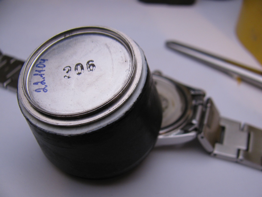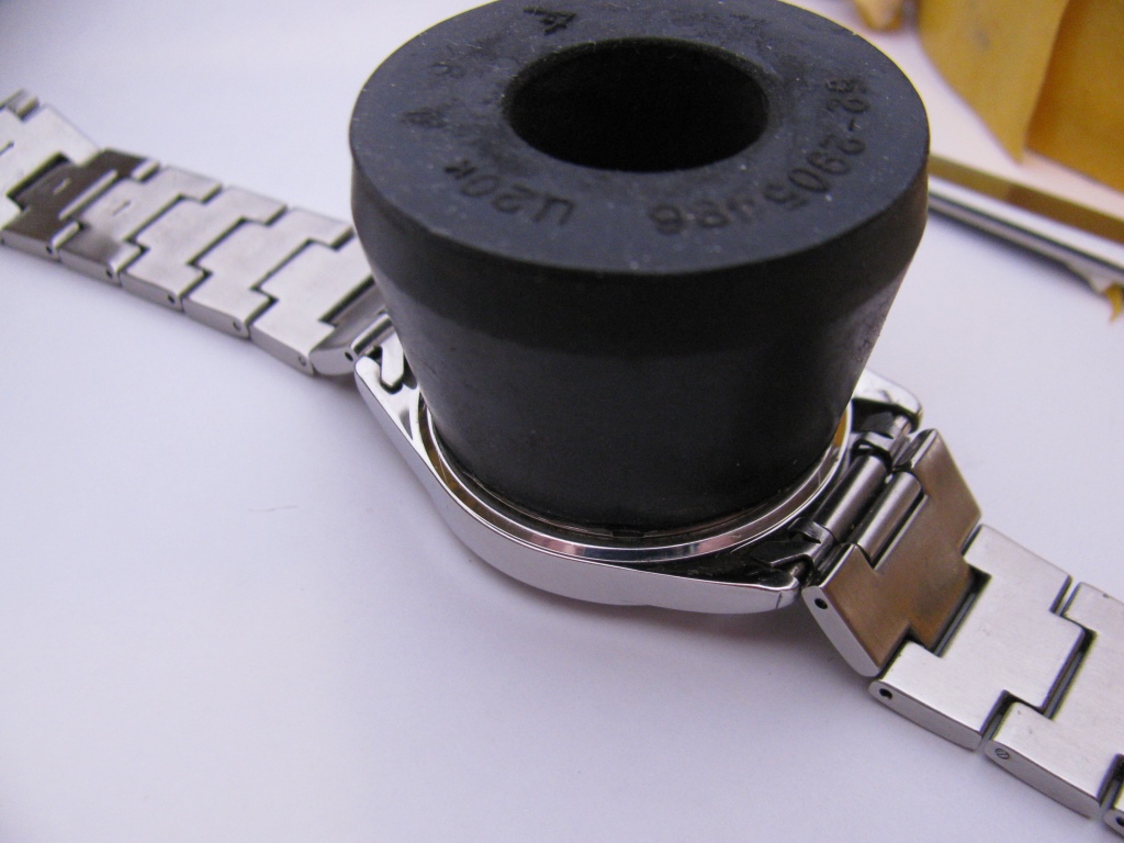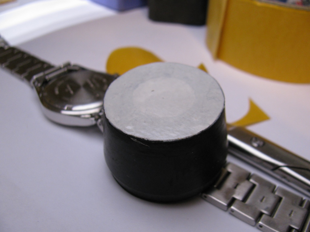 Поэтому взял баночку из под витаминов. Наклеил двусторонний скотч, причем полоской через бока. Так прочнее, чем просто кружок. Разъединил браслет и уложил часы на коврик от мыши. С большим трудом но отвинтил крышку.