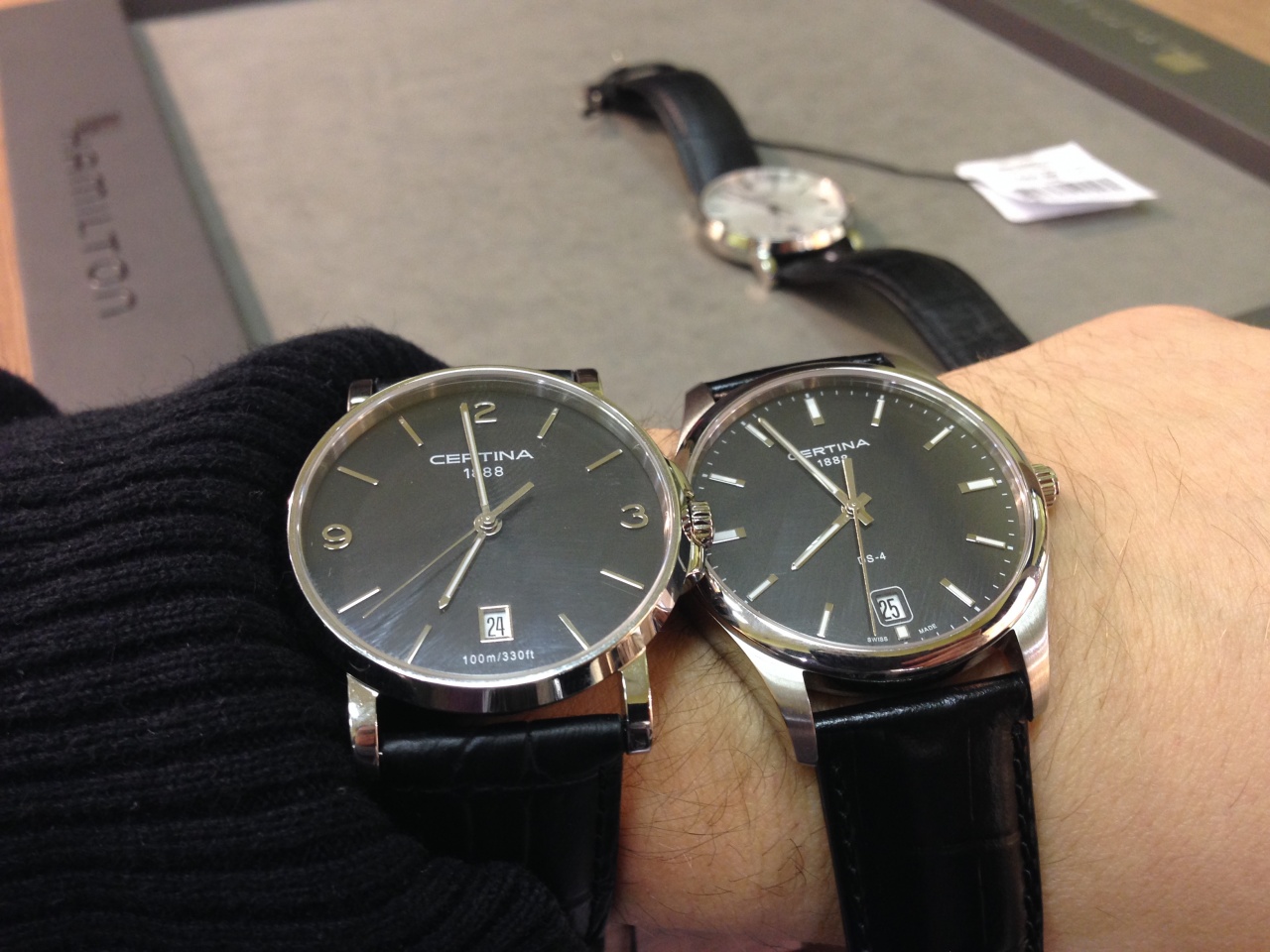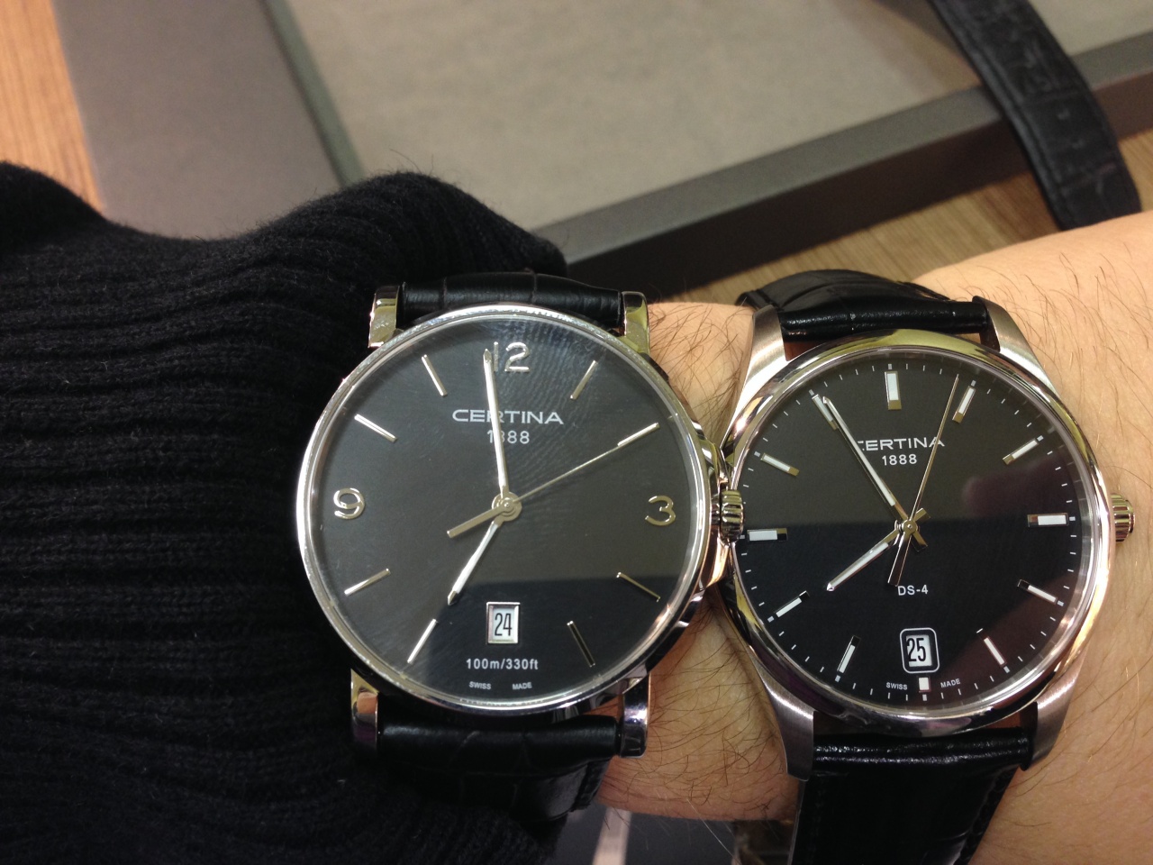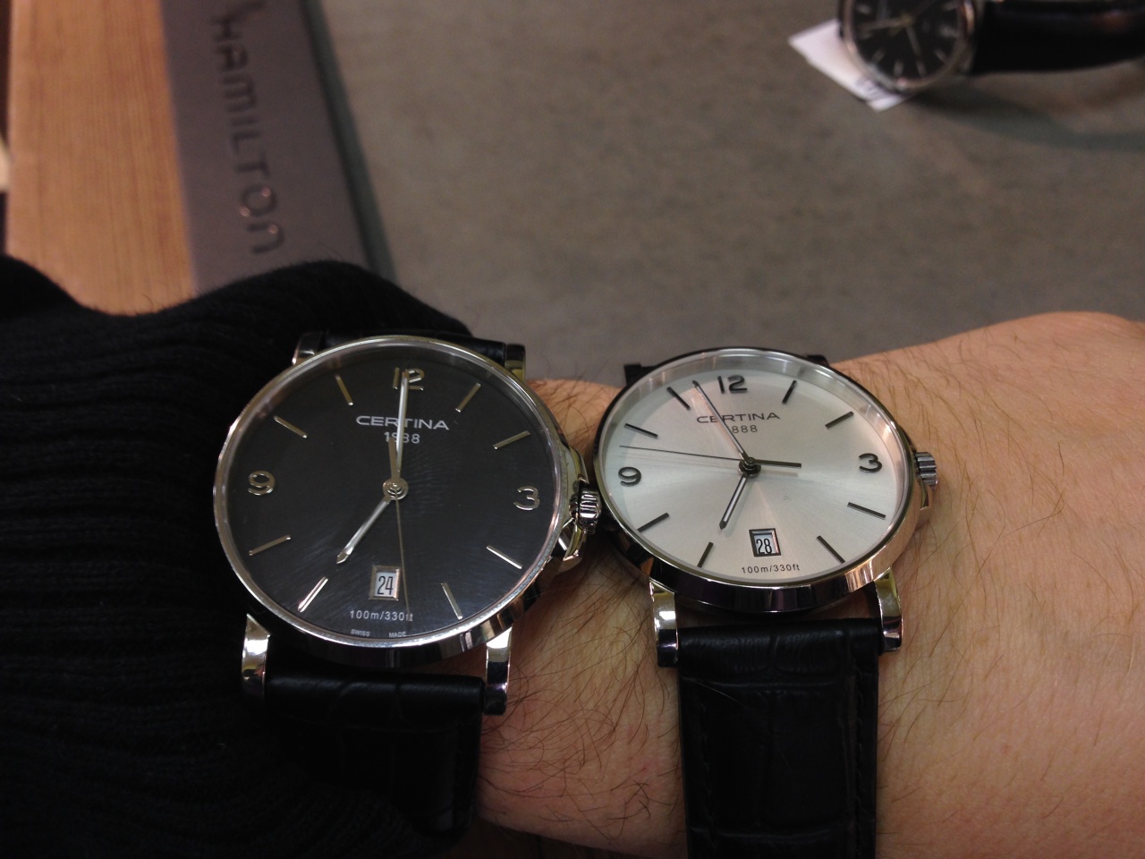 Certina DS Caimano 017.410.16.037.00 оказались совсем не белые как Tissot, а каким то светло серым металлическим покрытием. Трудно будет сочетать с одеждой. Из плюсов - на белом вообще не видно отпечатков пальцев. Черные в этом смысле расстраивают, протирать мобильный, очки, а теперь еще и стекло часов... печалька