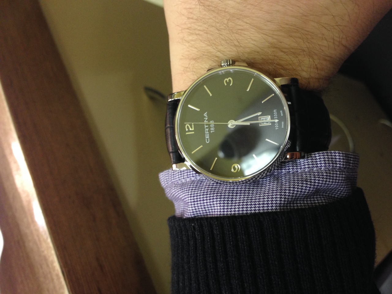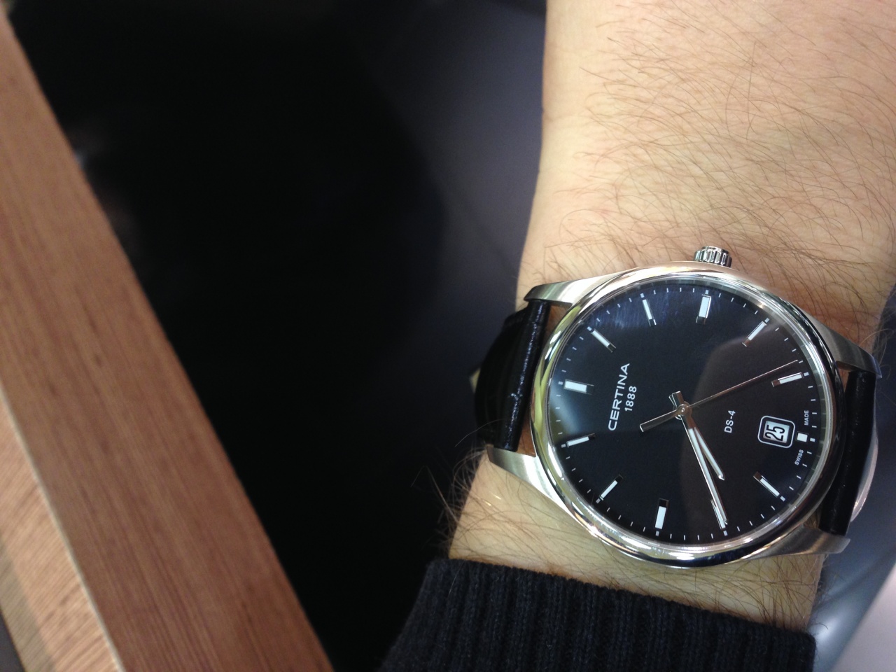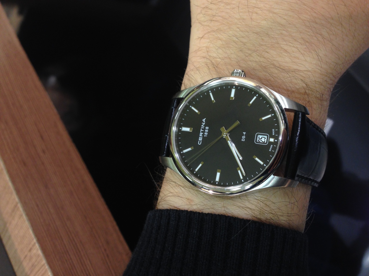 Certina DS Caimano 017.410.16.037.00 оказались совсем не белые как Tissot, а каким то светло серым металлическим покрытием. Трудно будет сочетать с одеждой. Из плюсов - на белом вообще не видно отпечатков пальцев. Черные в этом смысле расстраивают, протирать мобильный, очки, а теперь еще и стекло часов... печалька