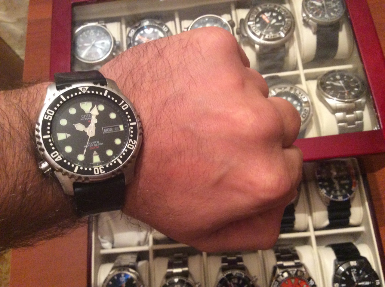 Citizen: EcoZilla Ti, JY8020-52E; Maurice Lacroix PT6058, Casio: Sea-Pathfinder SPF-60, Frogman GF-8230, Frogman GW-200Z, Frogman GW-225C, Frogman GW-200MS, GW-5000, Manaslu PRX-2000T Были: Casio King GXW-56, Seiko Sumo, MTG-S1000D