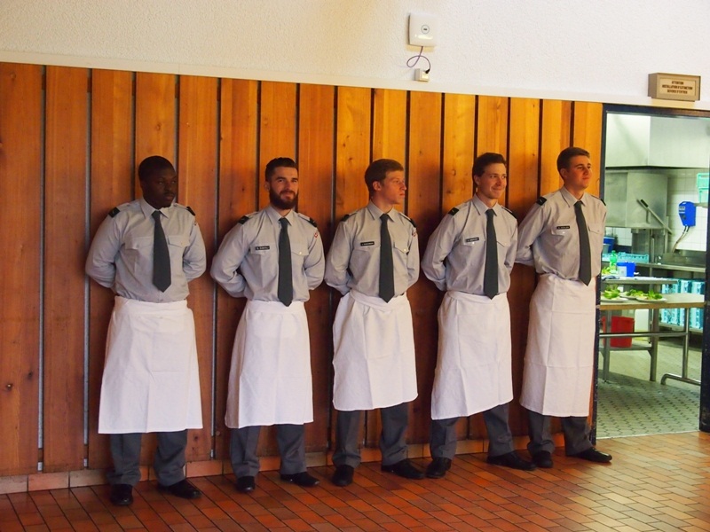 После лекции нам пригласили отобедать в армейской столовой, сразу честно признавшись, что в обычные дни столы накрыты менее пышно, а десерт в меню не входит. Но для гостей сделали исключение, заодно пригласив разделить с ними трапезу тех из призывников, кто лучше владеет языками и способен поддержать разговор. Меню было скромное, но сытное и сбалансированное: зеленый салат, грудка индюшки с картофельно-морковным гарниром, крем из белого и черного шоколада с соусом из ягод. Заметьте, цвета овощей в салате были подобраны в соответствие с национальной символикой, украшавшей бумажные салфетки и одноразовые стаканчики.
