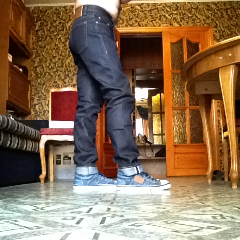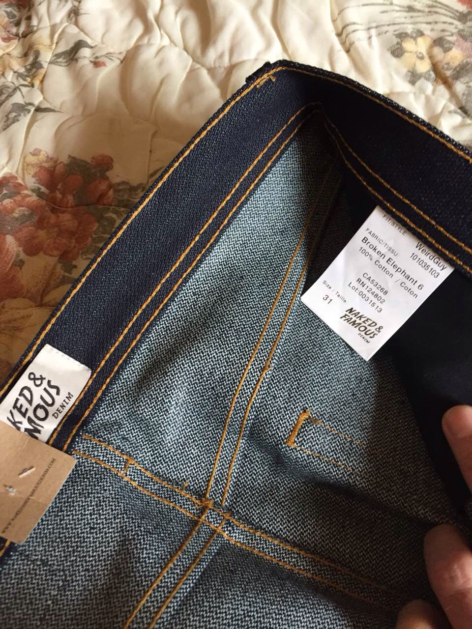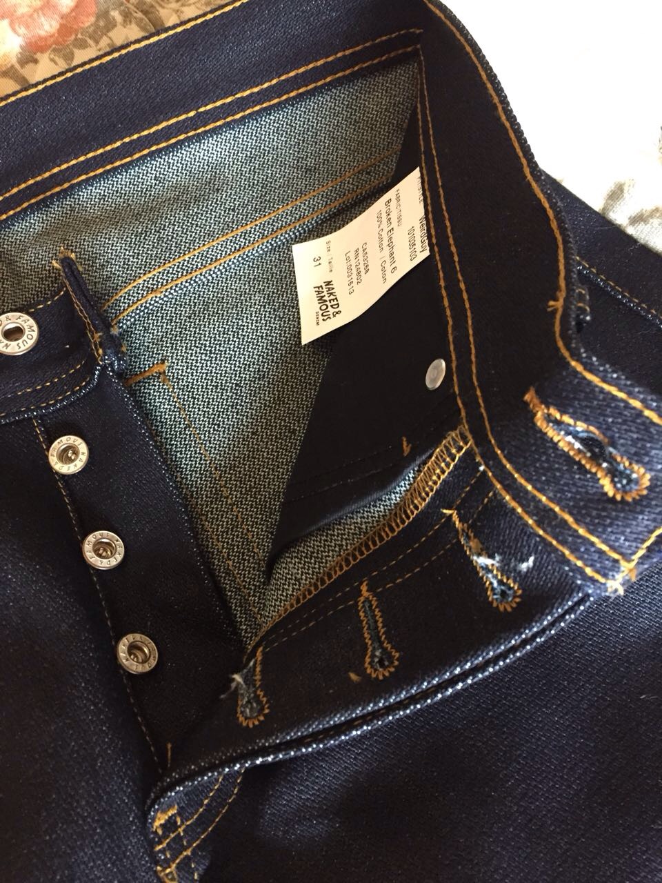 22 унции в "ёлку"- это надо видеть и мацать....непередаваемые ощущения брутального жёсткого денима. Цвет денима темно синий, насыщенный, обещан контрастный фэйд. Поверхность гладкая, глянцевая, как стеклянная. Уток выделяется необычно крупной ёлкой ....все таки 22 оз !