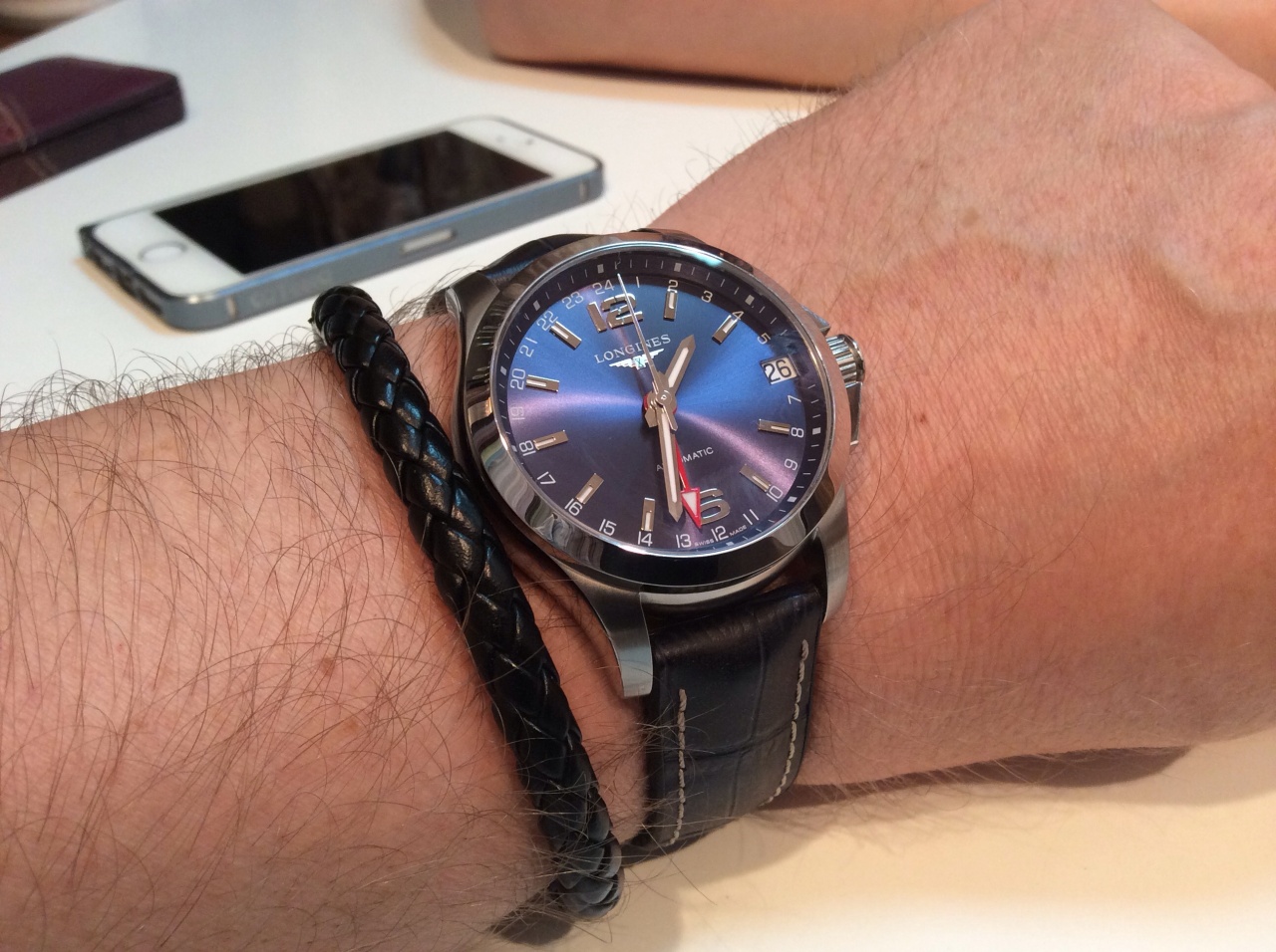 После примерки ощущения следующие,очень красивые часы,прекрасный синий,пожалуй лучший синий из всех конквест,он скорее Омеговский,выглядят действительно очень премиально,толщина придает часам солидности и компенсирует(лично для меня) маленький размер,так как самые маленькие у меня сейчас 42 мм,думаю уже меньше некуда,но понимаю что ГМТ это нечто другое.