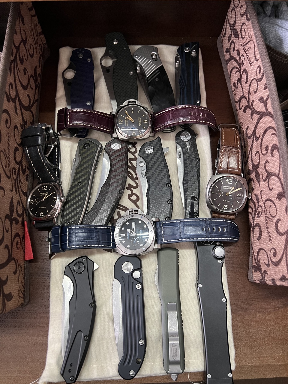 Есть - Rolex (Submariner Date, Yacht-master), Cartier Santos , Breitling Super Chronomat, Omega Seamaster Diver 300M, Panerai (01351, 01229, 00346, 00233, 00998) Были - Omega Seamaster 300M, Rolex (Turn-O-Graph, Hulk, Submariner No Date, Datejust 41) , Breitling (Superocean Heritage 46 & 42, Superocean Heritage II 42, Chronomat Evolution, Chronomat 41,42,44, Superocean Heritage II хронограф, Navitimer ), Cartier Santos 100 XL , Breguet Marine Big Date, Zenith Pilot Bronze, Panerai (00312, 01392, 00927, 00795, 01321, 01316, 00572, 00723, 00268)