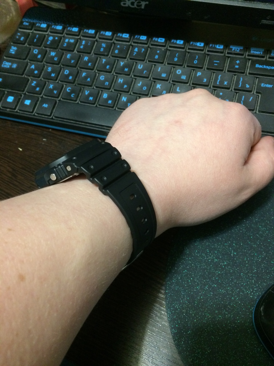 Но самое разочарование меня ждало, когда я надел часы на руку. Пластиковые ремни до этого не носил - пластик не приятен на руке, с обратной стороны различные выступы врезаются в руку. Браслеты ношу очень свободно, а кожаные ремни привык носить хоть и не очень плотно, но так, чтобы часы не крутились на запястье - здесь оба "режима" не комфортны! А всё дело в длине ремня. Длинная часть (с дырочками) достаточной длины для моего запястья (запястье 19см), примерно длиной как у кожаных ремней длиной L, такой длины я всегда и беру, но вторая часть, которая с пряжкой - она очень короткая! В итоге, в застегнутом состоянии она находится не на нижней стороне запястья, а сбоку! У людей с ещё бОльшим запястьем она вообще будет как пряжки на НАТО ремнях - полностью с торца запястья!