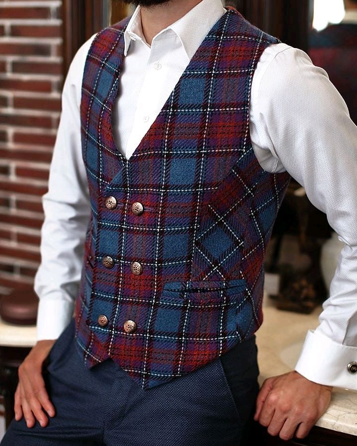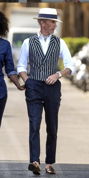 Честно говоря, перебирая множество вариантов сочетания жилеток и брюк (без пиджака) именно в той стилистике , которая мне нравится , практически все сочетания похожи на униформу сотрудников банкетного зала. Да и меня на самом деле это не особо парит.