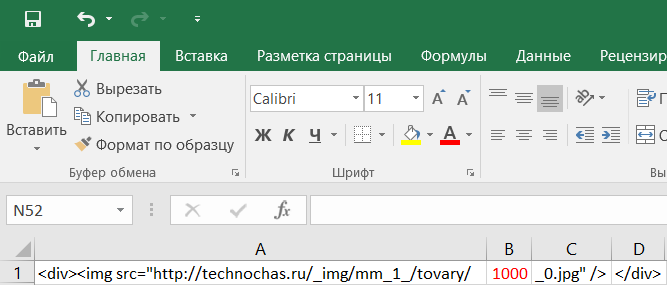 2. Разбиваем url на статичную (чёрный цвет) и динамическую части (красный) и оборачиваем в теги div в Excel: