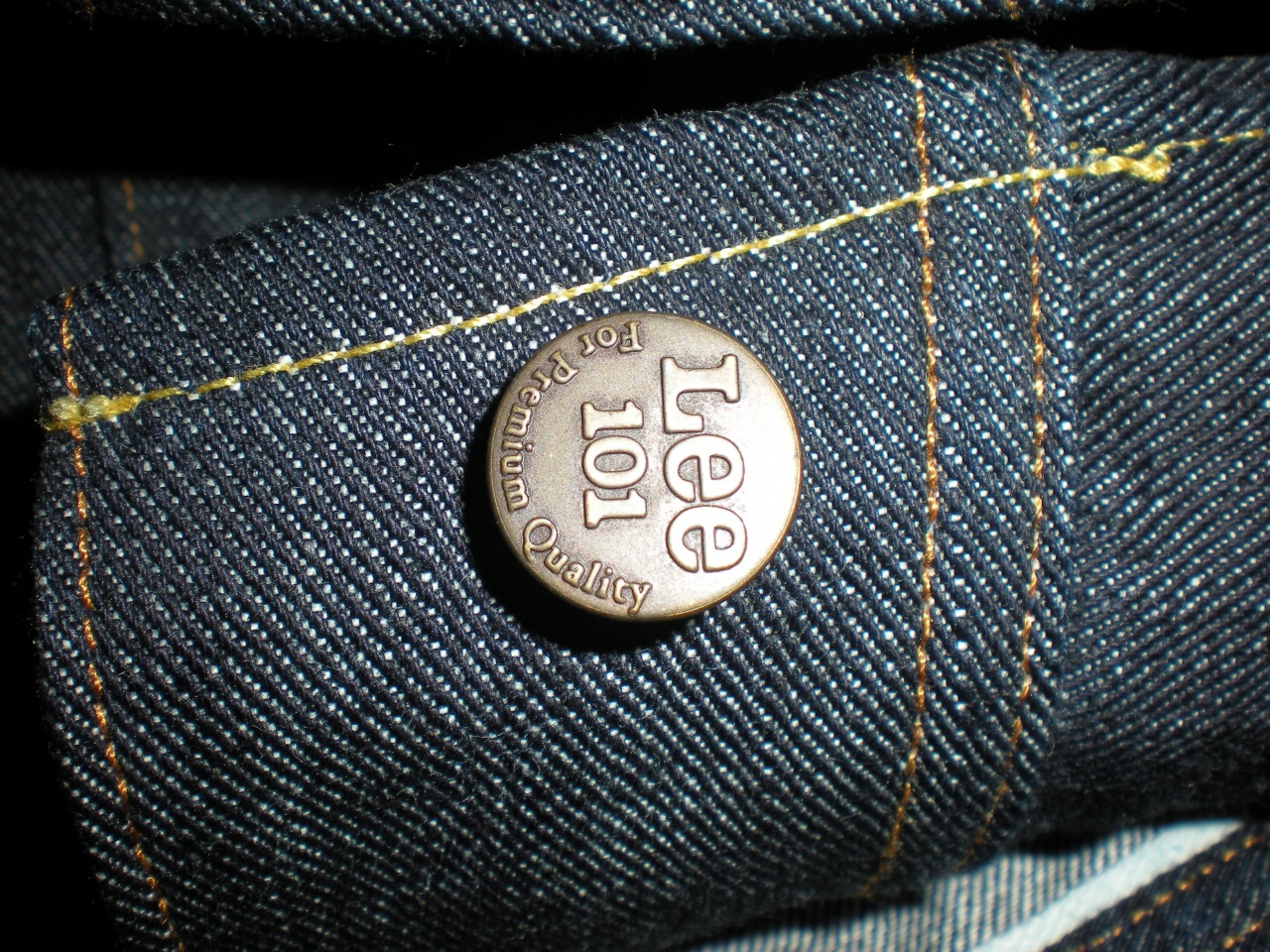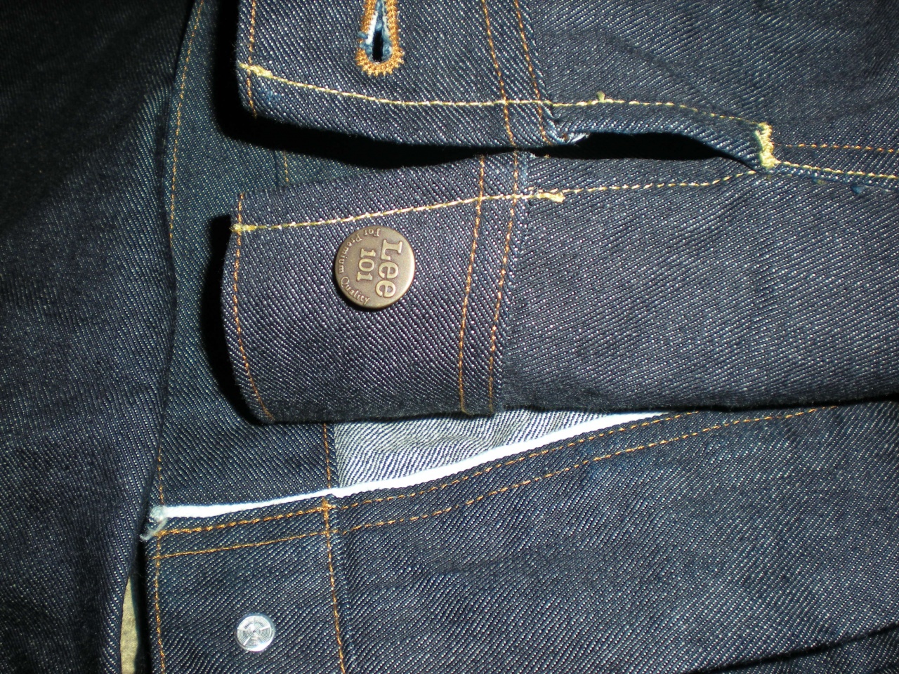 Детали: скажу сразу - карманов для рук нет (этот вопрос многих волнует, но лично мне достаточно двух нагрудных), брендированные болты, двухцветная строчка - табачного и лимонного цвета, сзади на поясе лямки с пуговицами "кошачий глаз" (носят декоративный характер, т.к. низ и так узкий, затягивать больше нет смысла), прошитая зигзагом передняя планка. В общем - все характерные для классического Lee rider jacket приятные детали в наличии.