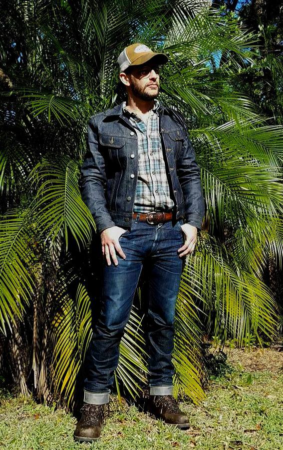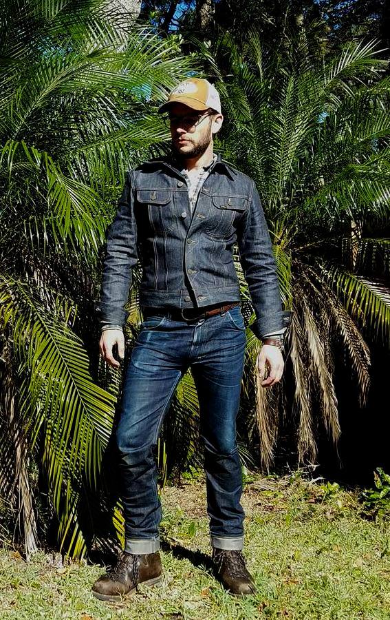 Деним: сырой санфоризированный левосторонний селвидж-деним от японской Kurashiki Mill, кромка видна с внутренней стороны по всему низу и на петле-вешалке. Плотность 11,5 унций, первоначально и после первого замачивания очень жесткий, после двух дней эксплуатации стал значительно мягче. Цвет денима сложно передать, сине-стальной, что-ли. В описании пишут - 16 dip natural indigo process