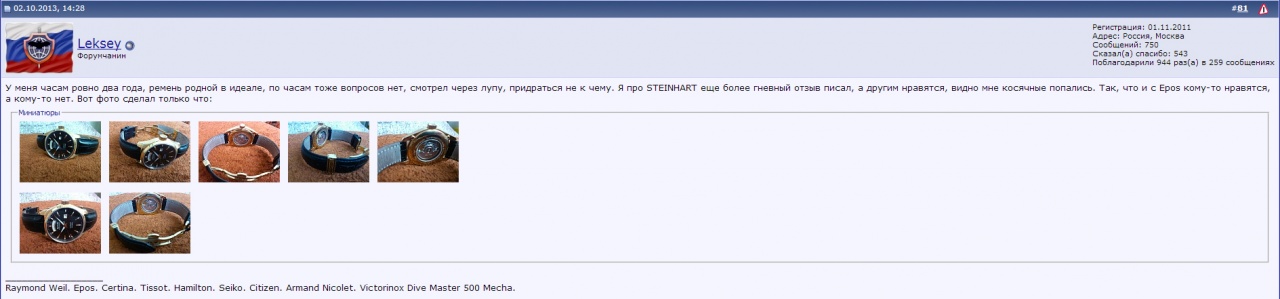 У меня часам ровно два года, ремень родной в идеале, по часам тоже вопросов нет, смотрел через лупу, придраться не к чему. Я про STEINHART еще более гневный отзыв писал, а другим нравятся, видно мне косячные попались. Так, что и с Epos кому-то нравятся, а кому-то нет. Вот фото сделал только что: