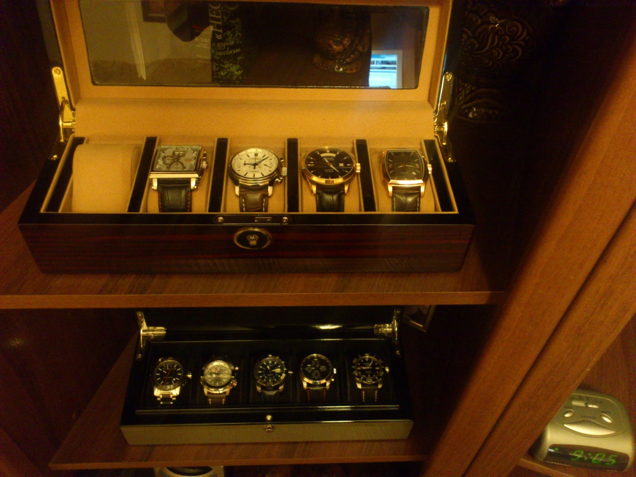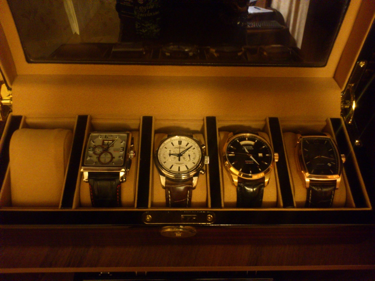 коробочка у меня кстати не кожанная, а маленькая обклеенная пленкой под дерево..ничего особенного..но собственно так как покупал часы, а не коробку не смотрю на них в принципе.