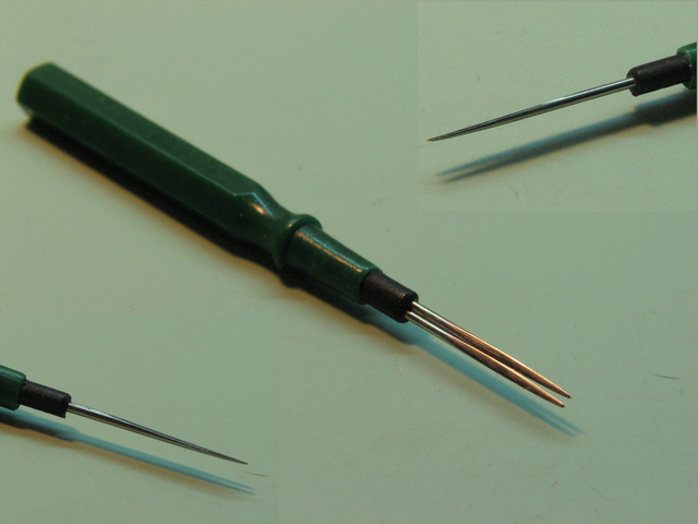Выбираю пару тупых швейных игл нужного диаметра и длины, припаиваю их вместе с оловом, на другом конце. Стачиваю половину толщины иглы, затем полирую, а концы помещаю в рукав, в трубку термоусадки, которая служит для упругости игл. По окончании, я вставляю инструмент в держатель, сделанный из пластиковой ручки, старой маслодозировки. Вообще не трудно изготовит самому.