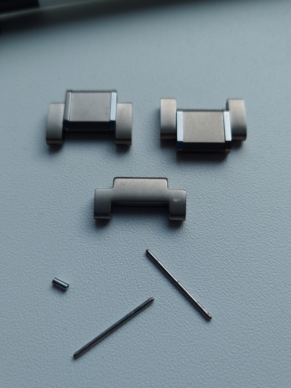 Собственно браслет, со всеми комплектующими. В отличии от обычных шпилек где одна сторона с утолщением, которые удобно на шпилькосъемнике выжимать, здесь непонятная тема со внутренней втулкой, и просто так ее не выдернешь, поэтому подогнать (прибавить/убавить/перекинуть звено) тоооооо еще удовольствие, на Мидо занимает минуту где то.