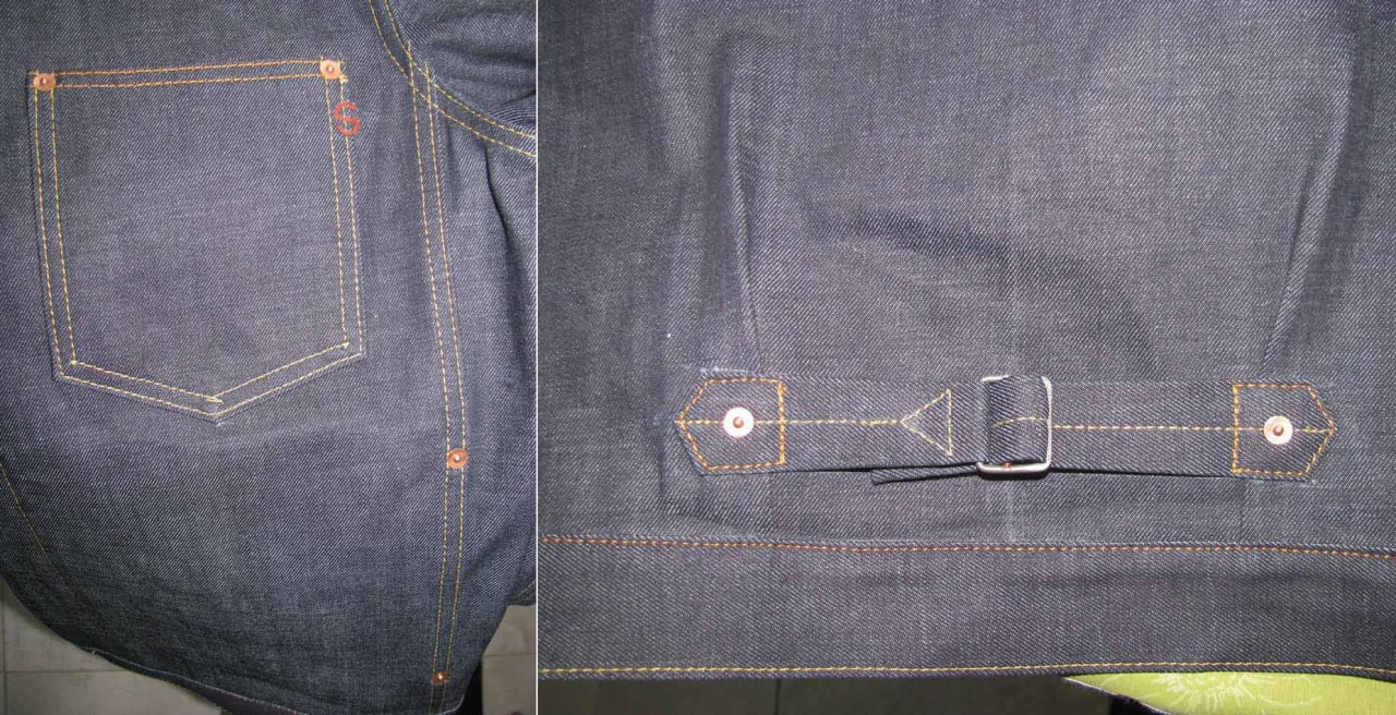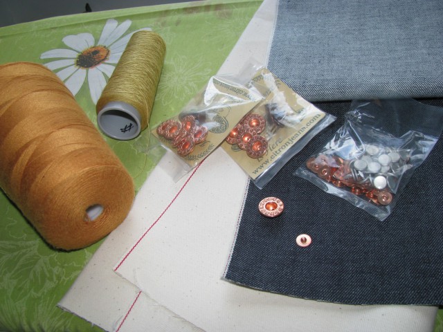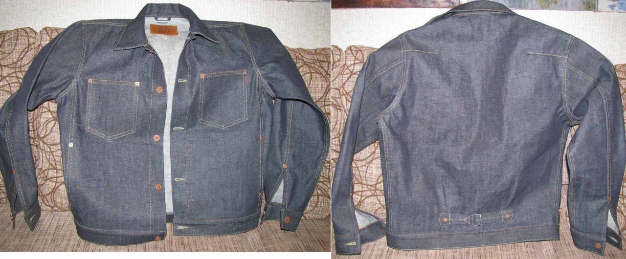 Предыдущий мой пост был о пошиве джинсов. Теперь я решил сшить себе джинсовую куртку. На этот раз я подготовился основательно. Купил селвиджденим знаменитой фабрики Kaihara, плотностью 14 унций, хлопковую ткань для мешковины карманов, плотностью 10 унций, пуговицы и заклёпки из сырой меди, нитки цвета «зелёный банан», пряжку для хлястика. Всё это из Японии. Рыжие нитки у меня были куплены раньше.