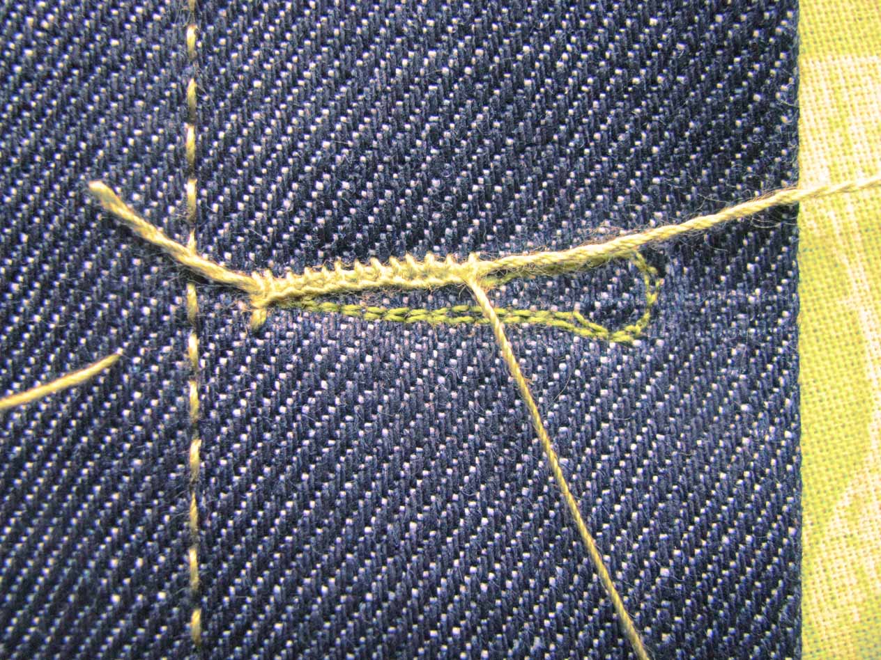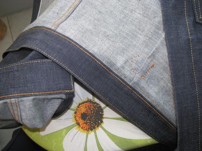 Вид с изнанки. Где необходим цепной стежок - там цепной, где нужен обычный - там обычный. Строчки выполнены нитками двух цветов: «зелёный банан» и рыжими. Так, как правило, шьются классические джинсовые куртки