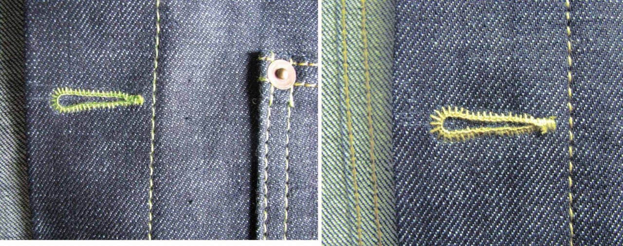 Изготовление петель под пуговицы хотел заказать в ателье. Но в ателье города не оказалось нужной петлеобмёточной машинки. Пришлось петли делать вручную. Посмотрел видеоуроки, попробовал, результат не понравился. Посидел, поэкспериментировал, сделал по-своему. Сначала наметил и положил двойную мелкую строчку