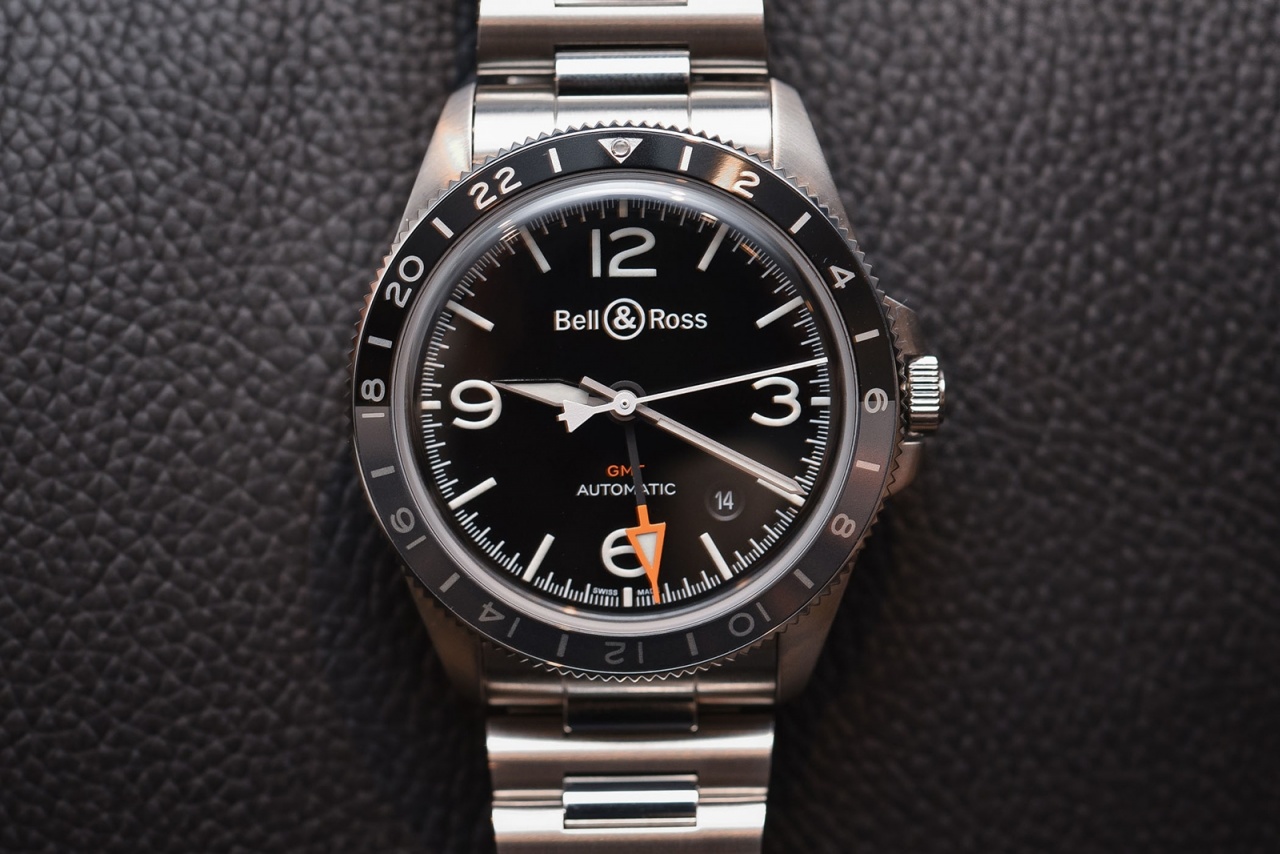 Время в третьей часовой зоне можно читать по вращающемуся в обе стороны безелю, оснащенному 24-часовой шкалой. Впервые в истории Bell & Ross безель, изготовленный из анодированного алюминия, сделан двухцветным: серым цветом отмечена зона, обозначающая день, черным – ночь.