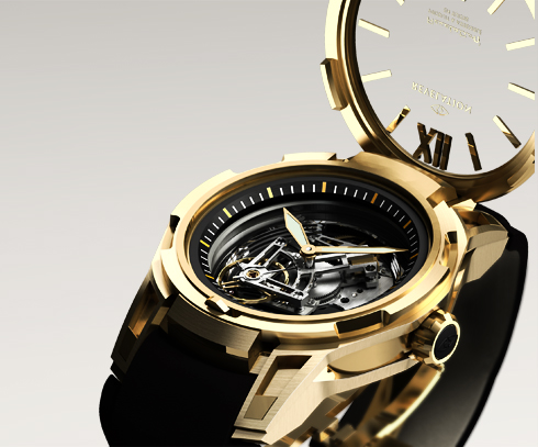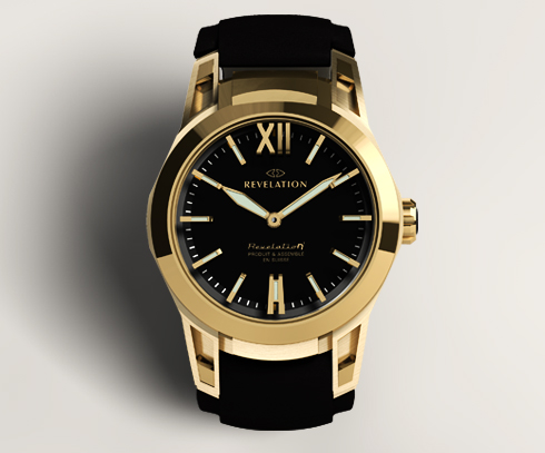 Молодая швейцарская часовая компания Revelation разработала и выпустила модель R01 Double Complication, которая отличается, как это и следует из ее названия, двумя усложнениями. Первое из них заключается в необычном турбийоне Tourbillon Manège, каретка которого вращается вокруг центральной оси циферблата с периодичностью один оборот в минуту (в качестве противовеса используется масса из 18-каратного золота). Второе состоит в наличии набора дисков из поляризованного стекла, которые располагаются друг на друге, образуя циферблат. С помощью специального запатентованного механизма (который состоит из червячной системы и сложной коробки передач), эти диски вращаются, причем вращение в одну сторону делает их прозрачными (при открытии на лицевой стороне корпуса крышки, состоящей из безеля и сапфирового стекла), "проявляя" механизм вместе с вращающейся кареткой турбийона, а в другую (при закрытии упомянутой крышки) - затемняет циферблат, делая его практически черным.