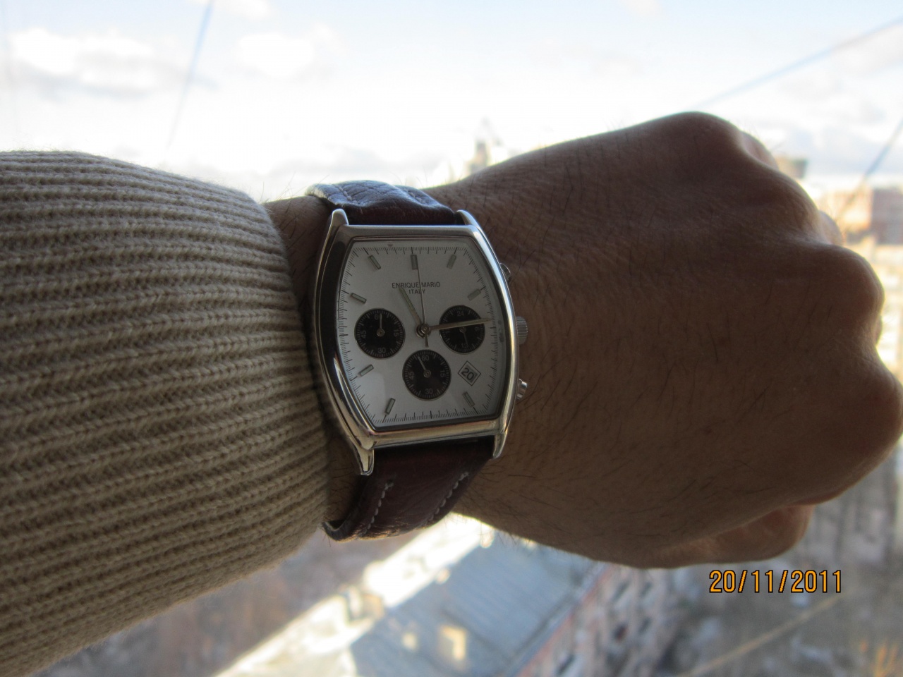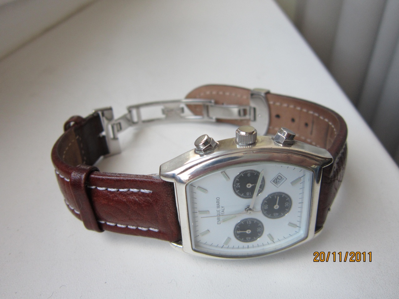 Купил в ювелирном магазине в Праге летом 2004-го. Очень приглянулась стильная элегантная серебряная бочка с итальянским названием. Кто не знает, полезная информация: отражательная способность серебра 95%, золота 84% (серебро ярче блестит, чем золото). Носил первые два-три года в офис. Последние три года лежат в шкатулке - перешел на механику. Батарейки менял только на дорогие Renata. Ремешок поставил новый, еще в приличном состоянии. Клипса-бабочка, сталь.