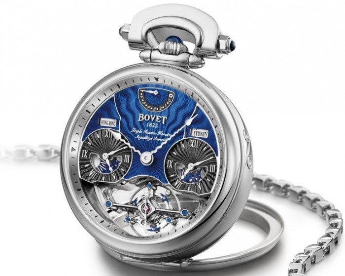Циферблат первой модели украшен яркой эмалевой миниатюрой. Эта цветочная композиция скопирована со старинных Bovet, сделанных в XIX веке. Во второй версии главным элементом декора стал синий циферблат, покрытый изящным гильоше. Часы показывают время в трех часовых зонах.
