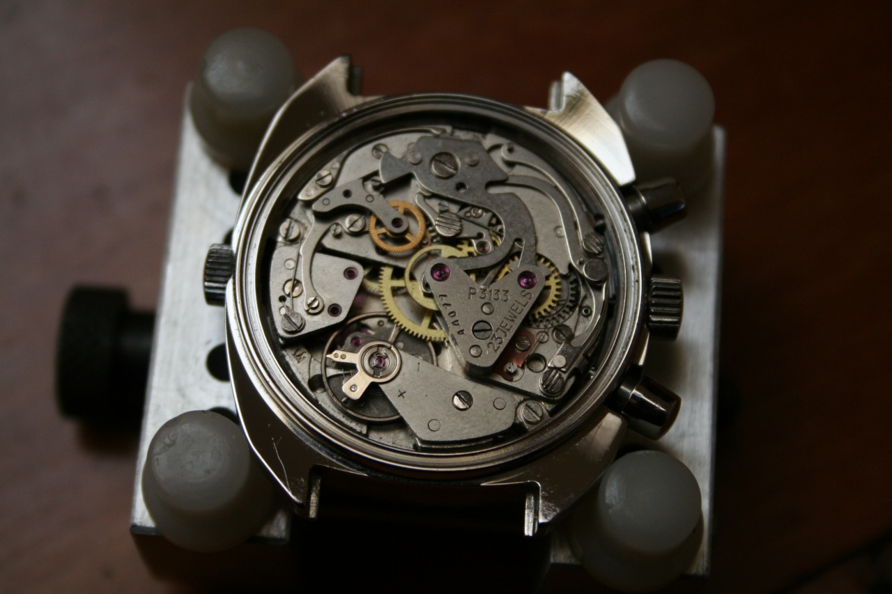 С помощью очень хорошего друга часы приведены в божеский вид. Все тикает, все работает. Лимб крутится, единственное, может кто поможет, нужна шестерня для его перевода, так как та, которая есть, переводит его, но с трудом, так как ее высоты не хватает.